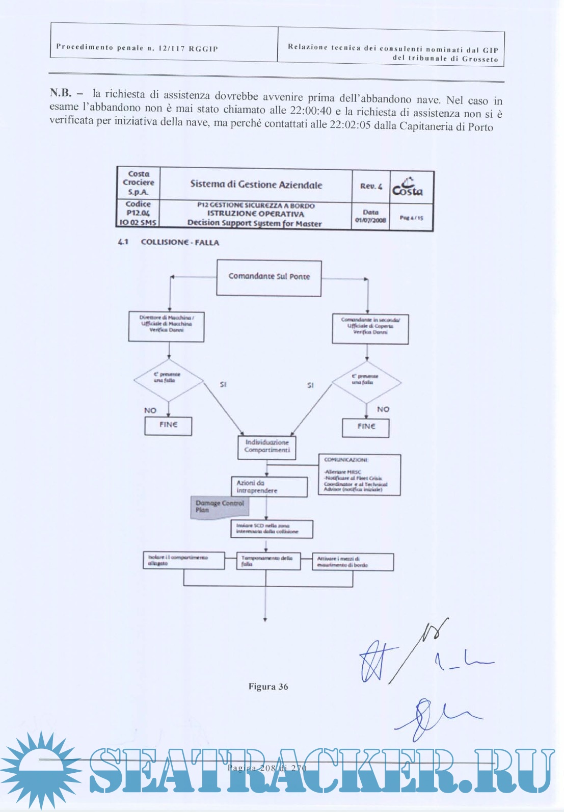 Year: 2012 Language: italian Author: Court's board of experts Genre: Documentation Publisher: n/a Format: PDF Quality: Scanned pages Pages count: 270 Description: Questo documento è la relazione tecnica del collegio dei periti nominati dal GIP del tribunale di Grosseto, relativo al sinistro della nave Costa Concordia. Il collegio peritale era costituito da due ammiragli (CP e Marina Militare) e da due ingegneri, docenti universitari , esperti di radar, comunicazioni e costruzioni navali. E' un'indagine estremamente approfondita sulle cause e gli errori che portarono al disastro della Costa Concordia, corredata da una vasto numero di allegati, annessi e documenti. This document is the technical report of the board of experts designated by the Court of Grosseto (Italy), about the Costa Concordia shipwreck. Board of experts was consisting of two admirals (Coast Guard and Italian Navy) and two engineers, university professors of radar, marine communications and ship building. It is an extremely thorough investigation into the causes and errors that led to the disaster of Costa Concodia, accompanied by a vast number of attachments, annexes and documents