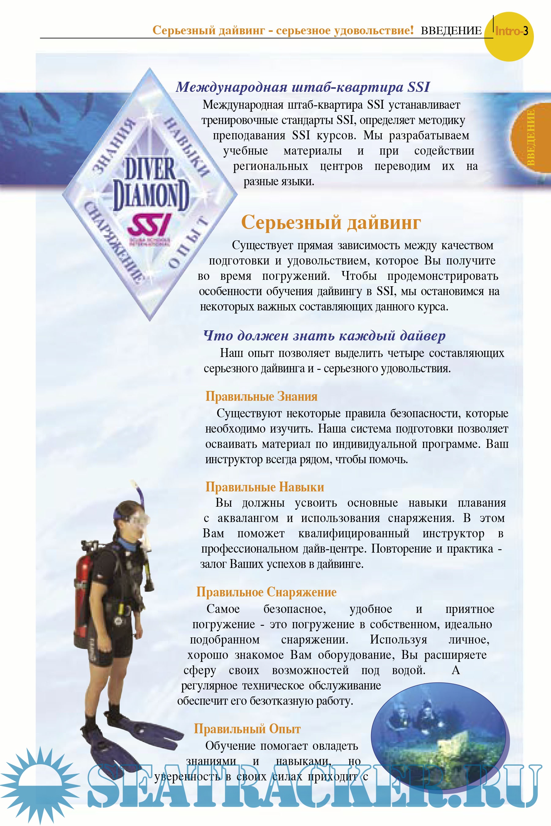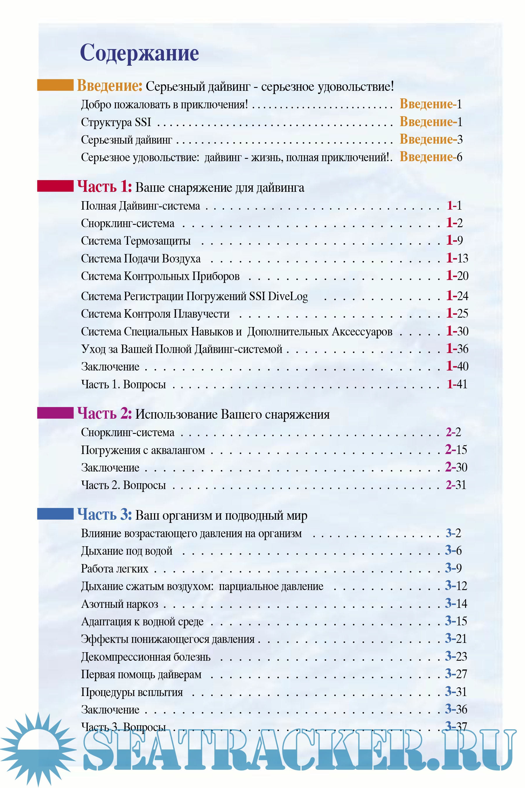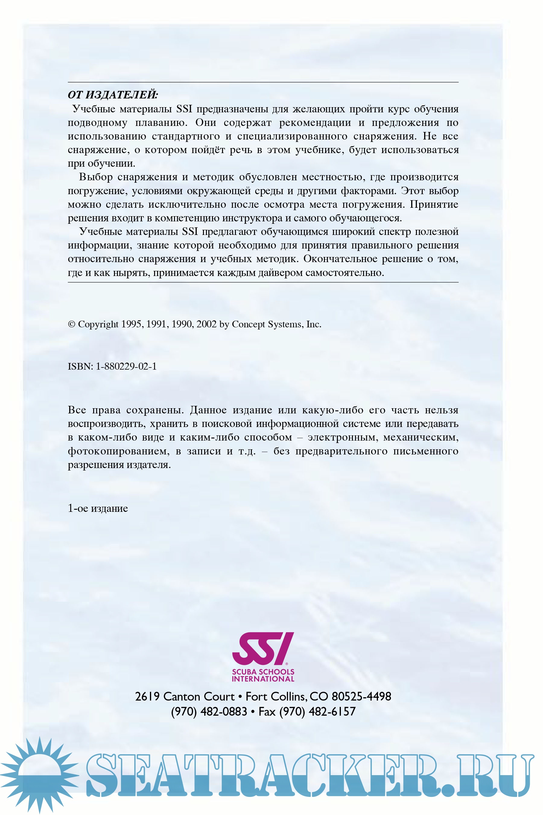 Год выпуска: 2002 Язык: русский Автор: SCUBA Schools International Жанр: Учебное пособие Издательство: Concept Systems, Inc. ISBN: 1-880229-02-1 Формат: PDF Качество: Изначально компьютерное (eBook) Количество страниц: 257 Описание: Учебные материалы SSI предназначены для желающих пройти курс обучения подводному плаванию. Они содержат рекомендации и предложения по использованию стандартного и специализированного снаряжения. Не все снаряжение, о котором пойдёт речь в этом учебнике, будет использоваться при обучении.Выбор снаряжения и методик обусловлен местностью, где производится погружение, условиями окружающей среды и другими факторами. Этот выбор можно сделать исключительно после осмотра места погружения. Принятие решения входит в компетенцию инструктора и самого обучающегося.Учебные материалы SSI предлагают обучающимся широкий спектр полезной информации, знание которой необходимо для принятия правильного решения относительно снаряжения и учебных методик. Окончательное решение о том, где и как нырять, принимается каждым дайвером самостоятельно. Заявление об ограничении ответственности. Дайвинг - это вид занятий, сопряженный с риском. Каждый дайвер в отдельности, принимающий участие в любом виде погружений, обязан согласиться с рисками и принять на себя ответственность за свои действия. Автор и издатель (и уж тем более раздающий) не несут никакой ответственности ни перед кем за утери, повреждения, травмы или смерть, вызванные любыми ошибками, пропусками в тексте, а также личной интерпретацией текста дайвером. Любая подобная ответственность не признается. Информация в данном пособии относится к дайвинrу с аквалангом и должна использоваться только как дополнение к утвержденному курсу обучения, который проводит сертифицированный инструктор.Данный учебник не может заменить профессиональный инструктаж и здравое отношение.