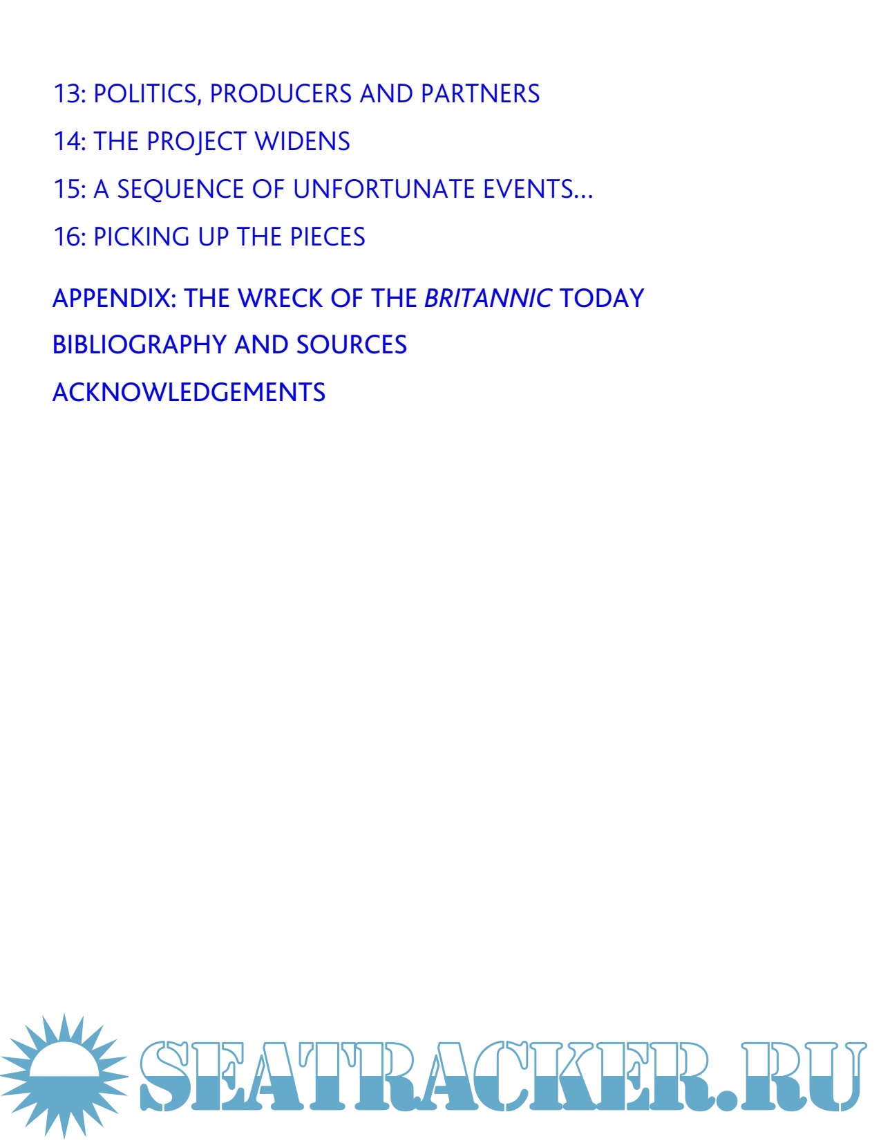 In addition to his camerawork he has helped to research a number of maritime-themed documentaries, authored or edited 11 books, and has for many years written articles on the Britannic and the Olympic class liners for maritime periodicals. All of this now takes second place to coordinating the development of the Britannic project, the wreck of which he bought in 1996.