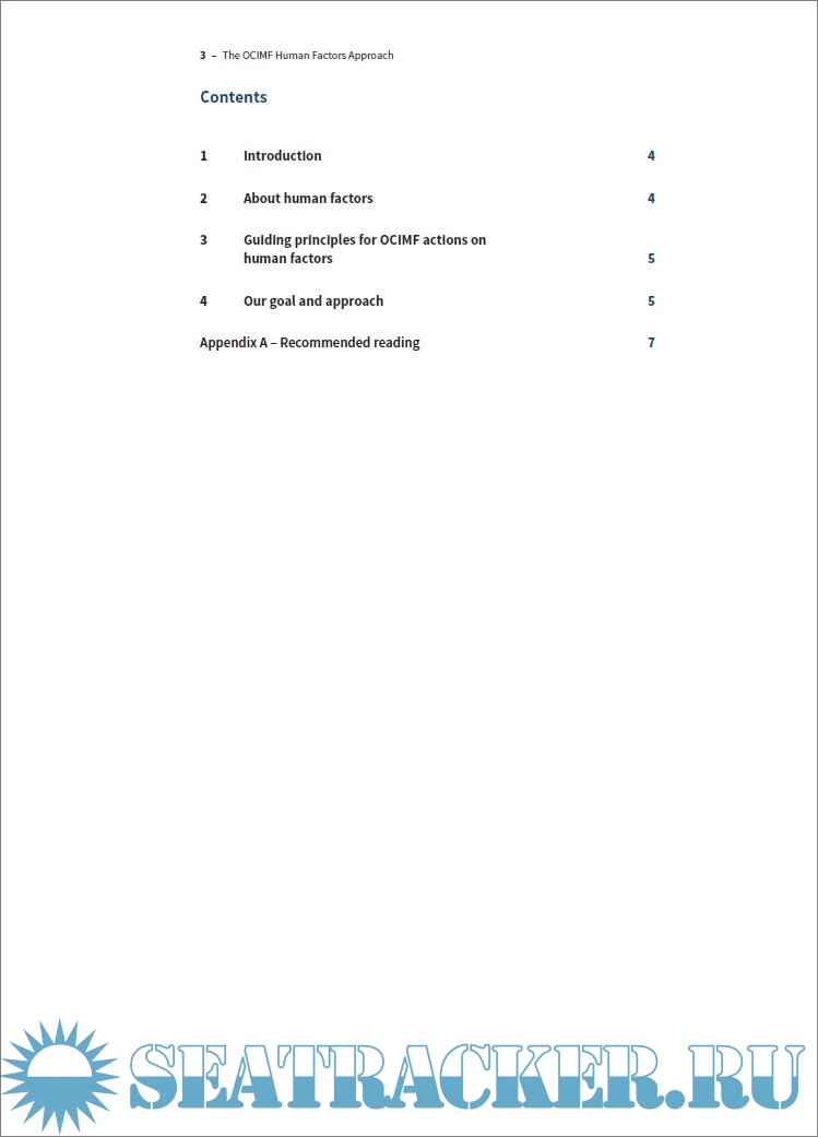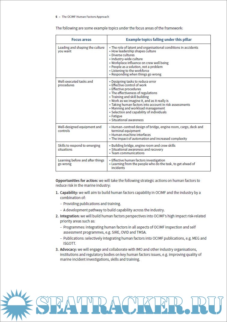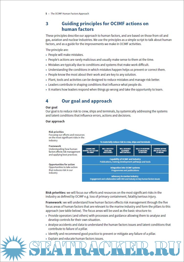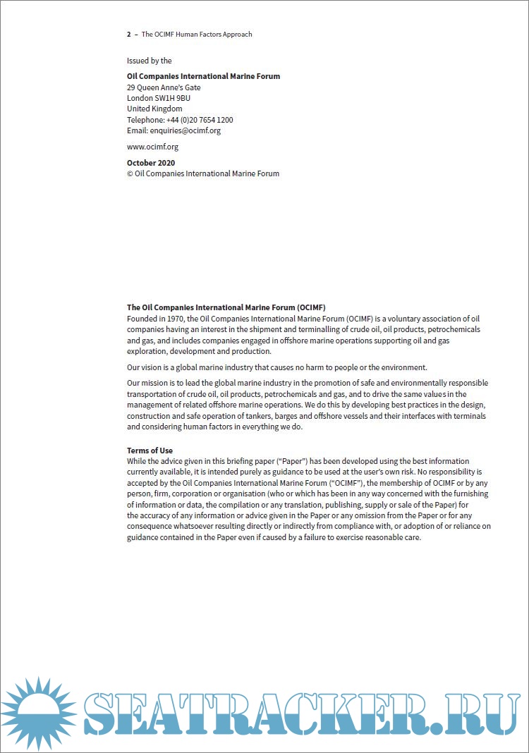 Description: OCIMF is a voluntary association of oil companies focusing on preventing harm to people and the environment. It promotes best practice in the design, construction and operation of tankers, barges and offshore vessels. OCIMF aims to improve safety and environmental protection in the maritime industry by considering human factors when providing guidance and recommendations. This information paper outlines OCIMF’s approach to human factors; it includes: a set of principles that guide OCIMF’s actions on human factors, an overall goal for OCIMF, a framework to understand how human factors issues impact operations, and opportunities to take action.