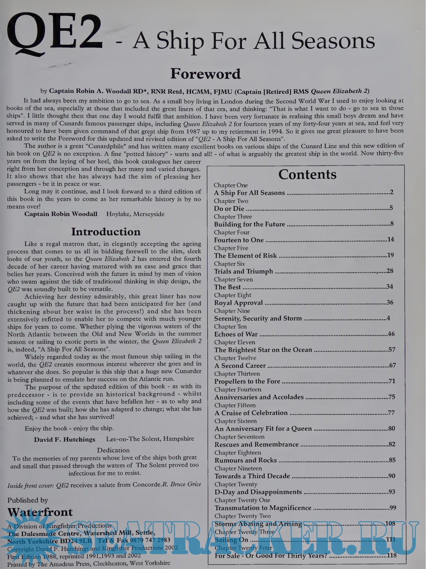 Description: The Queen Elizabeth 2 has entered the fourth decade of her career with an ease and grace that belies her years. Conceived with the future in mind by men of vision who swam against the tide of traditional thinking in ship design, the QE2 was soundly built to be versatile. Achieving her destiny admirably, this great liner has now caught up with the future that had been anticipated for her and extensively refitted to enable her to compete with much younger ships for years to come. Whether plying the vigorous waters of the North Atlantic between the Old and New Worlds in the summer season or sailing to exotic ports in the winter, Queen Elizabeth 2 is, indeed, ‘A Ship For All Seasons’.Widely regarded today as the most famous ship sailing in the world, the QE2 creates enormous interest wherever she goes and in whatever she does. So popular is this ship that a huge new Cunarder is being planned to emulate her success on the Atlantic run. The purpose of the updated edition of this book – as with its predecessor – is to provide an historical background – whilst including some of the events that have befallen her – as to why and how the QE2 was built, how she has adapted to change, what she has achieved and what she has survived! David F Hutchings 2002 (Author). Chapters: A Ship For All Seasons, Do or Die, Building For The Future, Fourteen To One, The Element of Risk, Trials & Triumph, The Best, Royal Approval, Serenity, Security & Storm, Echoes of War, The Brightest Star on the Ocean, A Second Career, Propellers to the Fore, Anniversaries & Accolades, A Cruise of Celebration, An Anniversary Fit for a Queen, Rescues & Remembrance, Rumours & Rocks, Towards a Third Decade, D-Day & Disappointments, Transmutation to Magnificence, Storms Abating & Arising, Sailing On, For Sale – Or Good for Thirty Years? A fully updated edition first published in 1988. Colour and black & white photographs.