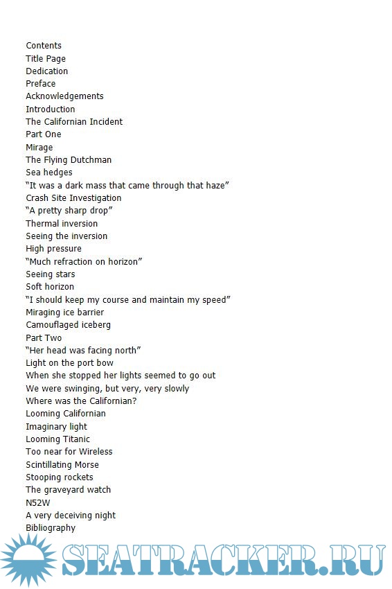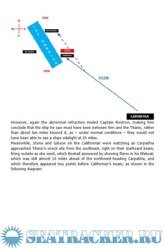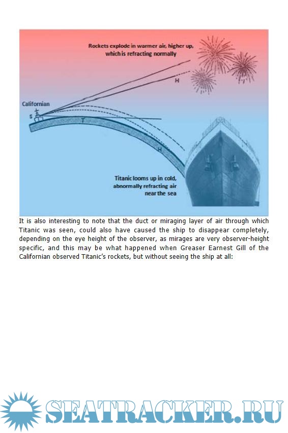 "Tim Maltin has shown that there was a strong superior-mirage display in the ice-field where Titanic sank, using both archival weather records and the logs of numerous ships in the area. The mirage and related refraction phenomena, such as looming, contributed to the confusion at the time of the accident. In particular, he has established that the crews of the Titanic and Californian saw each other's signals, but were unable to interpret them because of atmospheric effects acting in the unexpectedly large distance between the two ships."