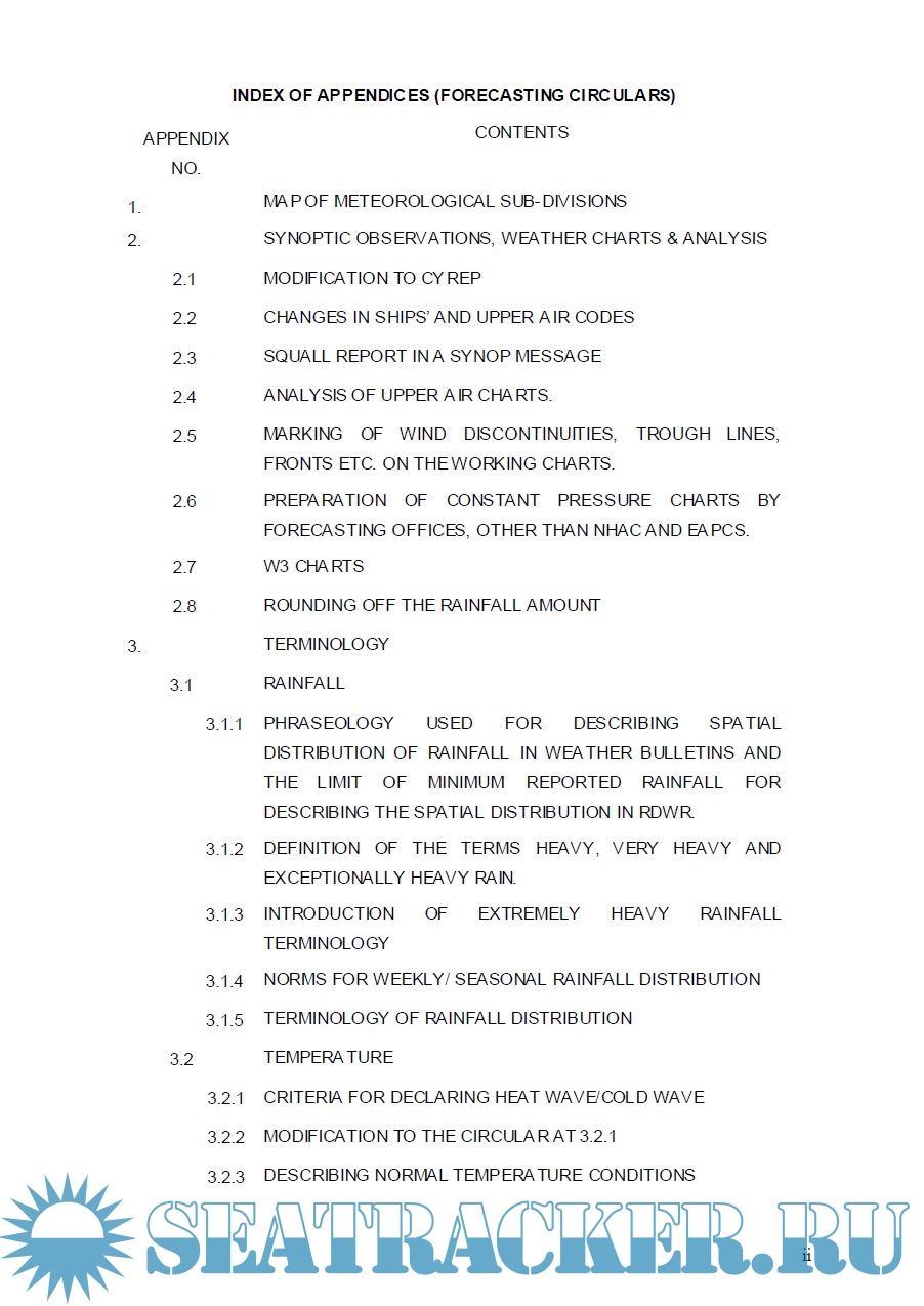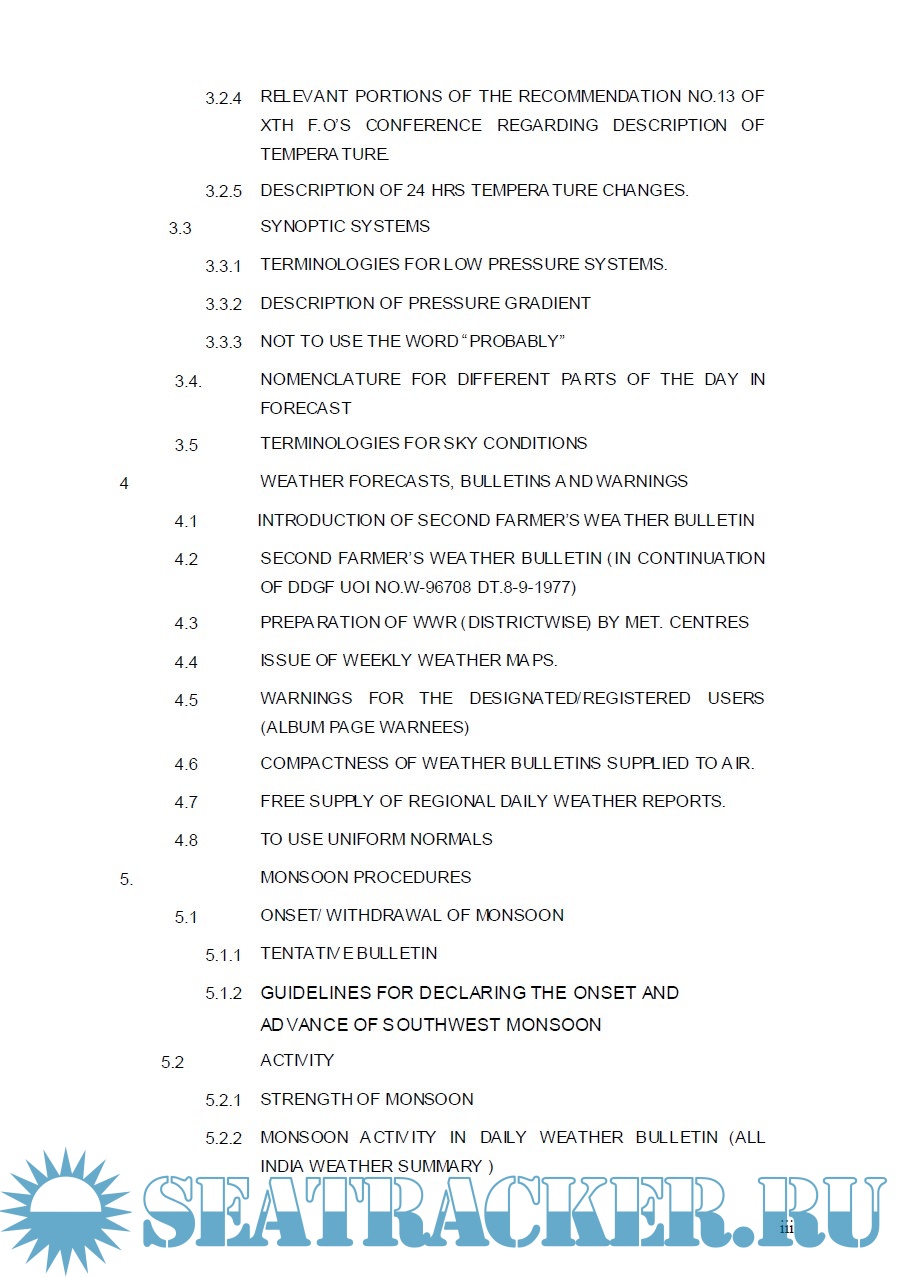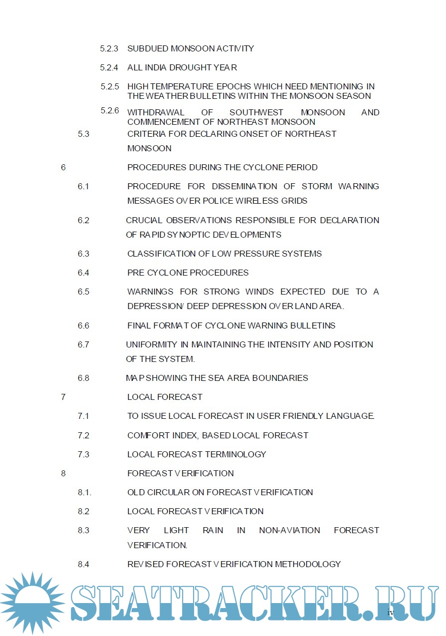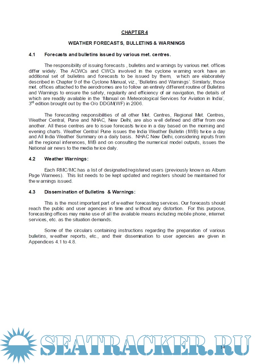 Description: Operational weather forecasting is one of the principal mandates of India Meteorological Department (IMD). In order to effectively accomplish this mission IMD, since its establishment, has been issuing a large number of instructions and technical regulations from time to time, as an aid to the forecasters. The basic purpose of such circulars is to maintain a specific standard and to bring about uniformity among all forecasting offices in their functioning. This publication is a compilation of forecasting circulars dealing with these instructions, which are relevant to the everyday meteorologist' work. It is aimed to serve as a ready reference for the field forecasters, therefore circulars are classified under sub-titles, and a comprehensive index is provided for the appendices.