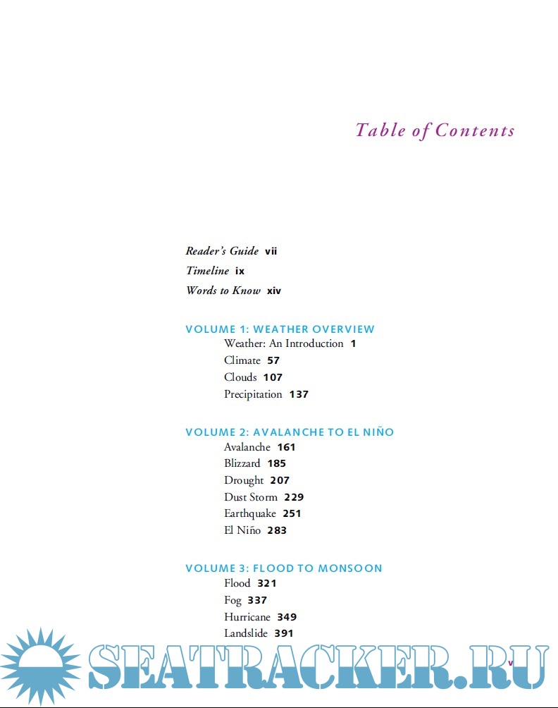 - Volume 1 is a general introduction to the topic of weather and natural disasters, including climate, clouds, and precipitation.