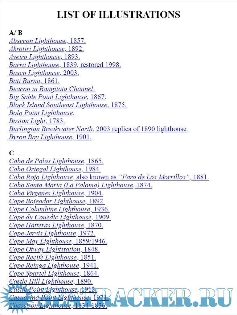 Year: 2010 Language: english Author: Victoria Charles Genre: Other Publisher: Parkstone Press International ISBN: 978-1-78525-928-9 Format: EPUB Quality: eBook Pages count: 192 Description: Lighthouses has guided sailors since antiquity. Due to the increasing development of modern navigational aids, these lone sentinels no longer have the crucial importance they once had. But they retain a role that testifies the beauty and the place they hold in our cultural heritage. This book presents some of the most spectacular lighthouses in the world. Content is divided by continents, illustrated by pictures and briefly described.