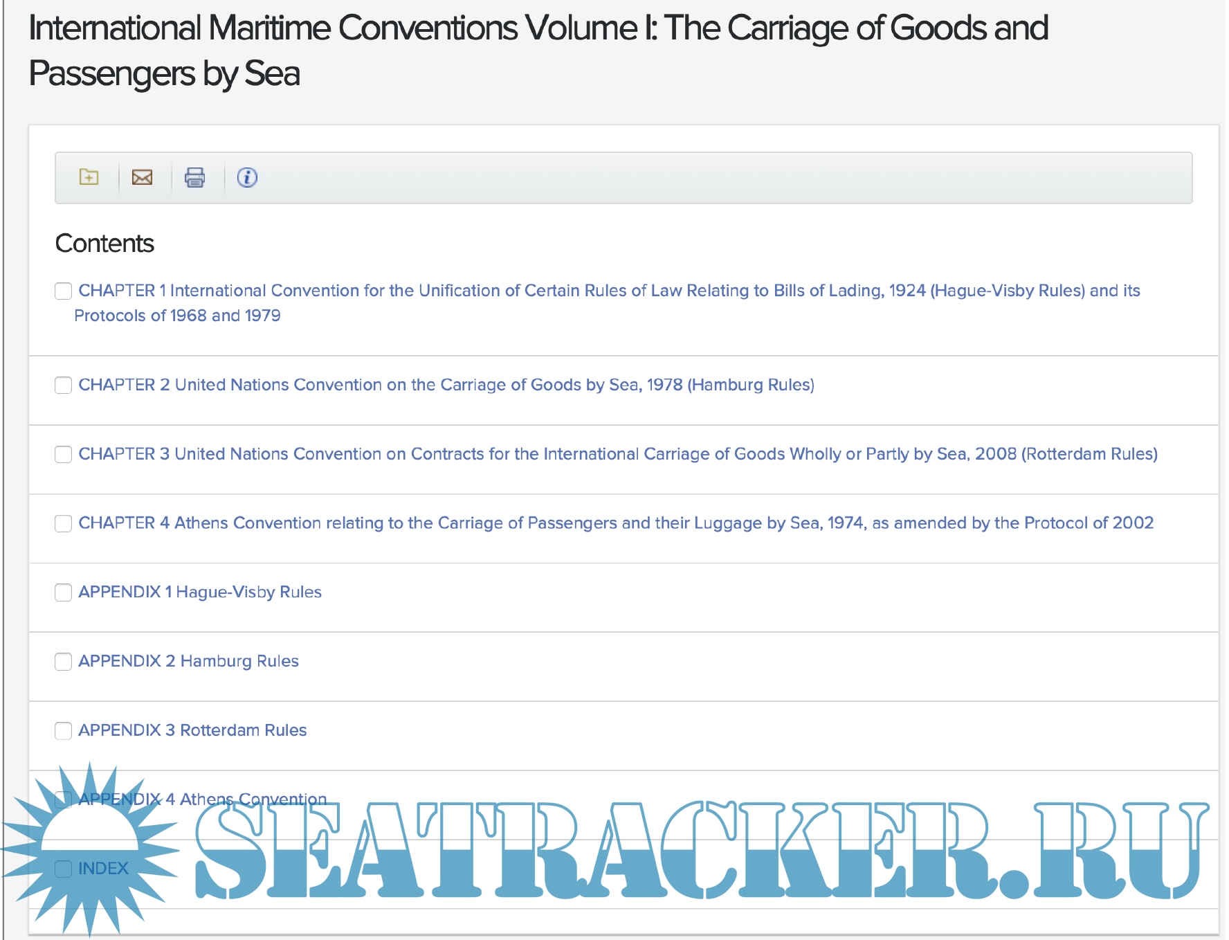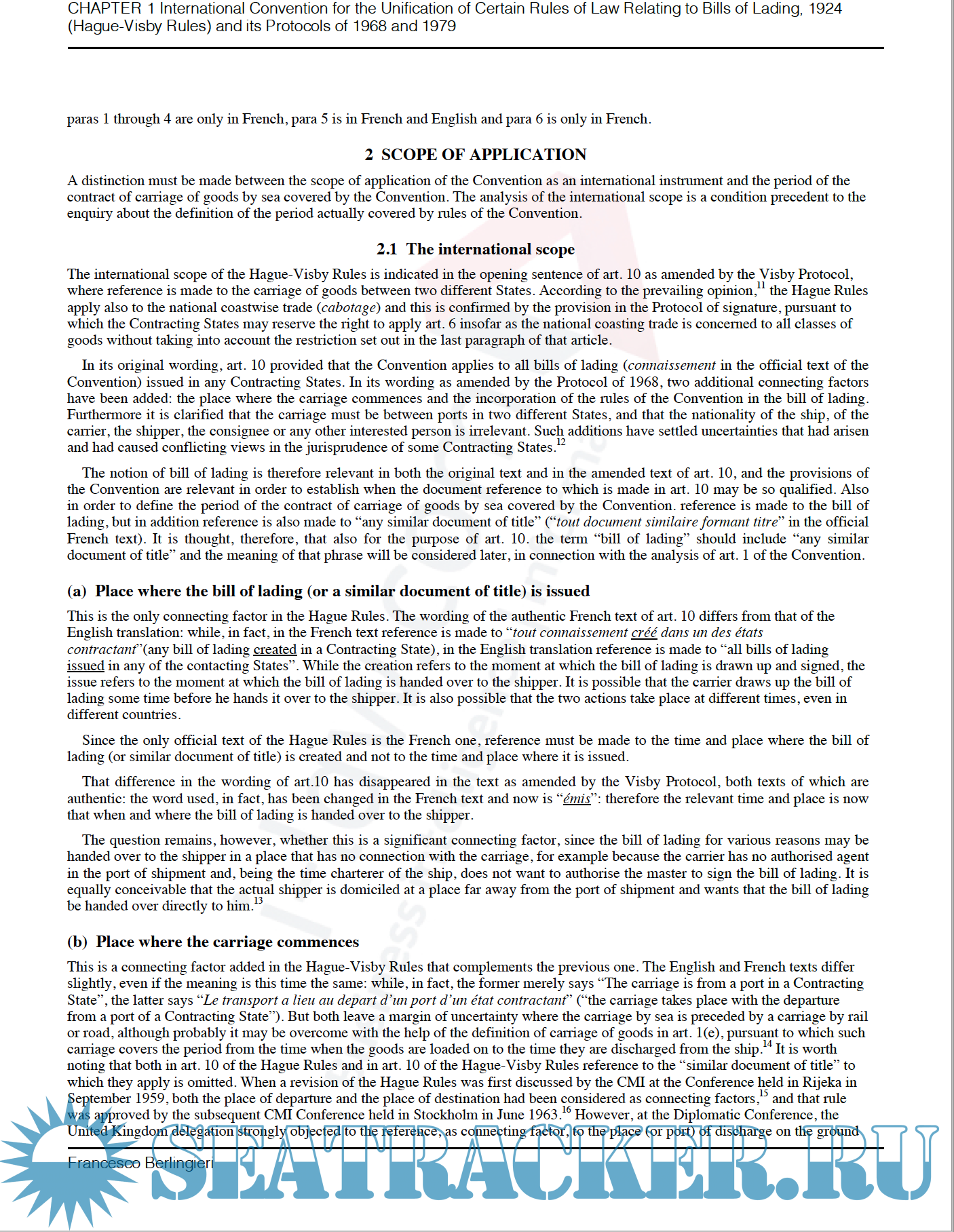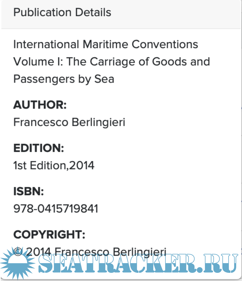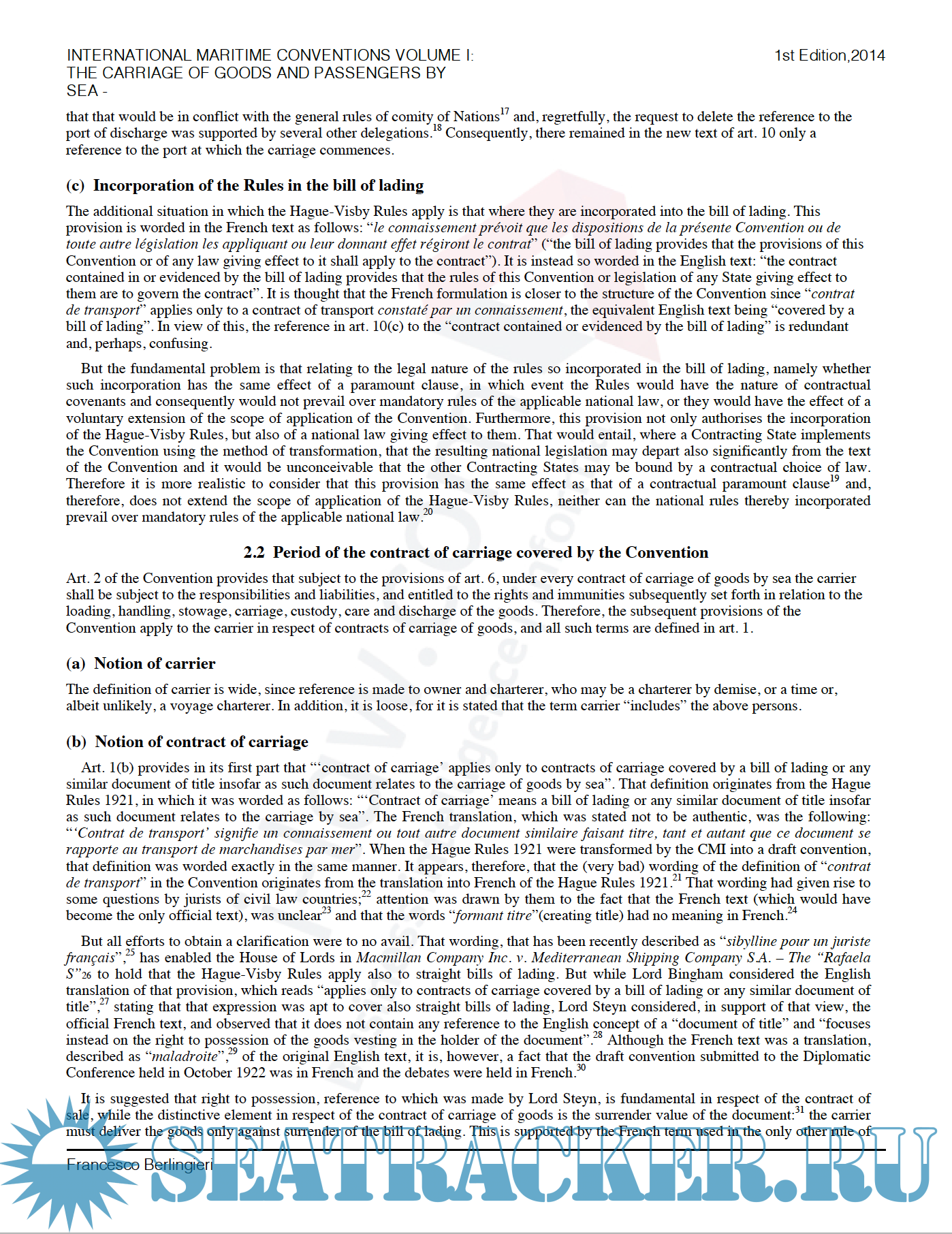 Year: 2014 Language: english Author: Francesco Berlingieri Genre: Textbook Publisher: Informa Law Edition: 1st ISBN: 978-0415719841 Format: PDF Quality: OCR without errors Pages count: 367 Description: It would be very difficult to understand the format of the International Convention for the Unification of Certain Rules of Law Relating to Bills of Lading, 1924 without the knowledge of its origin.1 Although it would be out of place to trace the history of the Hague Rules 19212 on which this Convention is based, it is thought that in order to understand the spirit with which they have been considered by the Comité Maritime International (CMI) the following introductory paragraph of the Report of the Commission appointed by the Conférence Internationale de Droit Maritime convened by the Belgian government in October 19223 may be of assistance: Additional info: Complete book except for front matter (TOC included, but no Table of Cases, Table of Legislation etc)