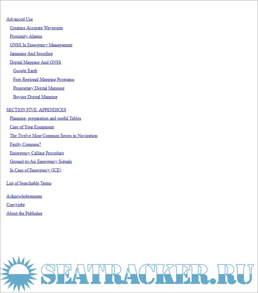 Even if not specific for nautical purpose, it is extremely interesting for seafarers and for anyone interested in navigation. See for example chapters on micronavigation, the concept of "legs" and waypoints, the expanding uncertainity area around the estimated position, the "relocation procedures" when lost, the basic celestial navigation with no instruments, bearings, transits and declination.