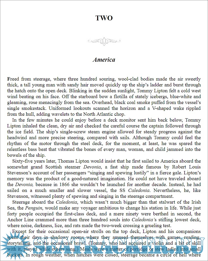 Year: 2010 Language: english Author: Michael D’Antonio Genre: History Publisher: Penguin Books - Riverhead ISBN: 978-1-101-18875-0 Format: EPUB Quality: eBook Pages count: 354 Description: This book is the story of a Scotsman who was born poor in Victorian age and ended up a self-made millionaire, adventurer, and sailing legend who contended for the America's Cup many times. Lipton’s attempts to win the America’s Cup, the renowned yachting trophy, gave him to the public on both sides of the Atlantic and made him a true celebrity, because there never was a more passionate competitor, but equally never a more gracious loser. And his failed quest drew great admiration and sympathy. In a 1931 visit to New York, SIr THomas Lipton was praised by Mayor Jimmy Walker as “the greatest sportsman of our time".