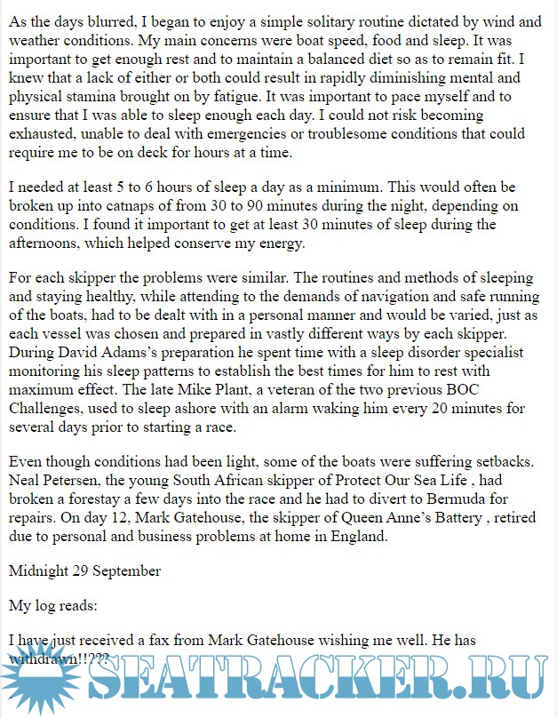 The book recounts the author's rescue of a fellow English competitor, his experience of being dismasted and rounding Cape Horn with a jury rig, and of the loss of his rudder north of the Falkland Islands, sailing with a steering oar to Punta del Este. Beyond this, it is a testament to Alan's extraordinary courage and determination in the face of overwhelming odds, and to his outstanding seamanship, for which he deservedly won two awards.