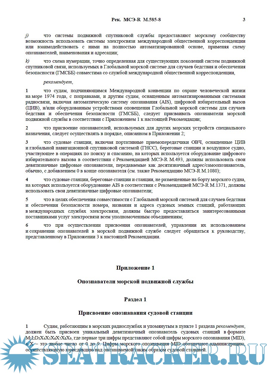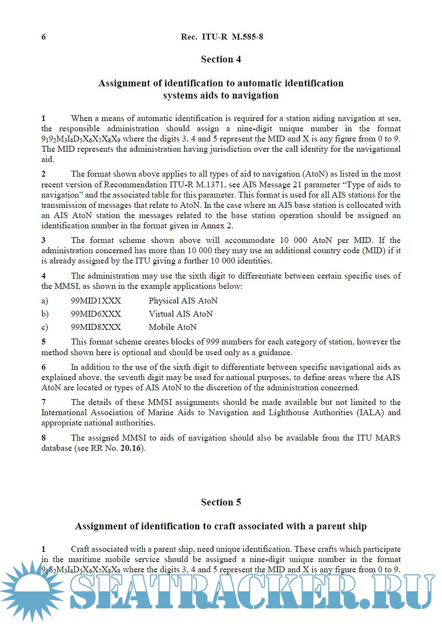 Description: This ITU Recommendation provides guidance to administrations for the assignment and conservation of identities for the maritime mobile service. Limitations and constraints for assignments regarding satellite services of the GMDSS are here described.