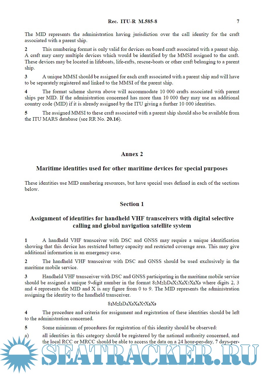 Annex 1 in particular describes formats for maritime mobile service identities (MMSI) of ship stations, coast stations, SAR aircrafts and other safety-related communications, automatic identification system (AIS) aids to navigation, and craft associated with a parent ship.