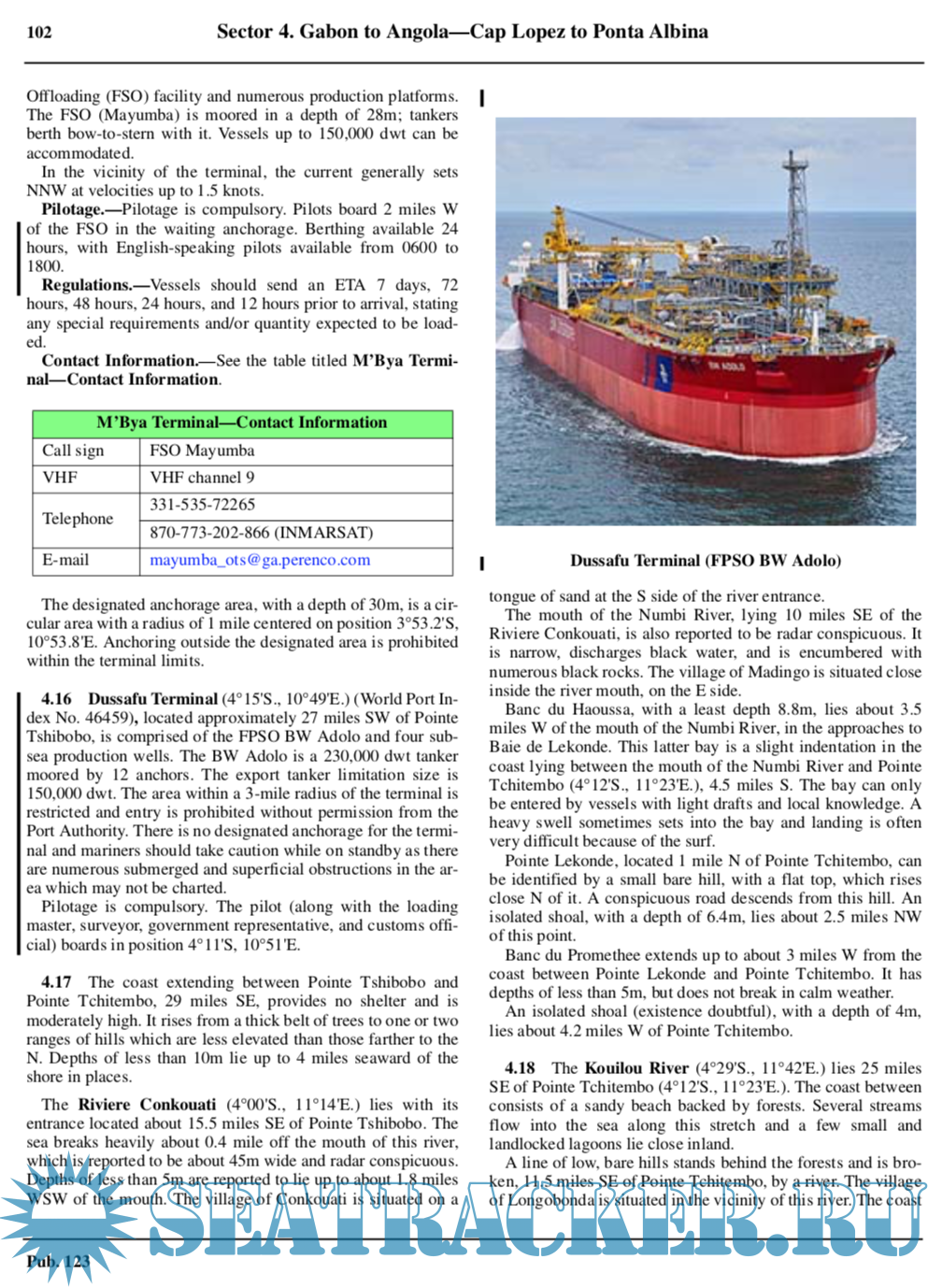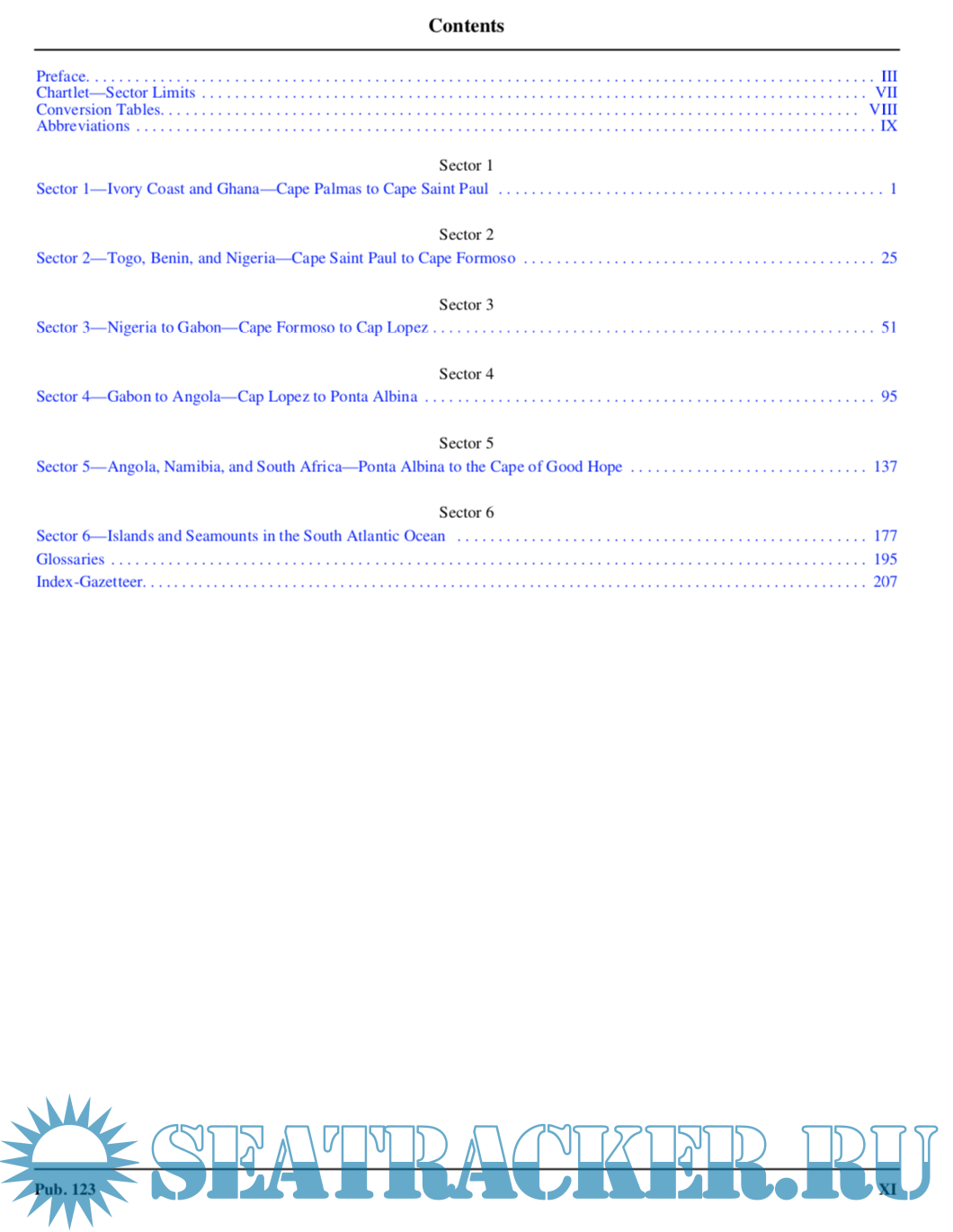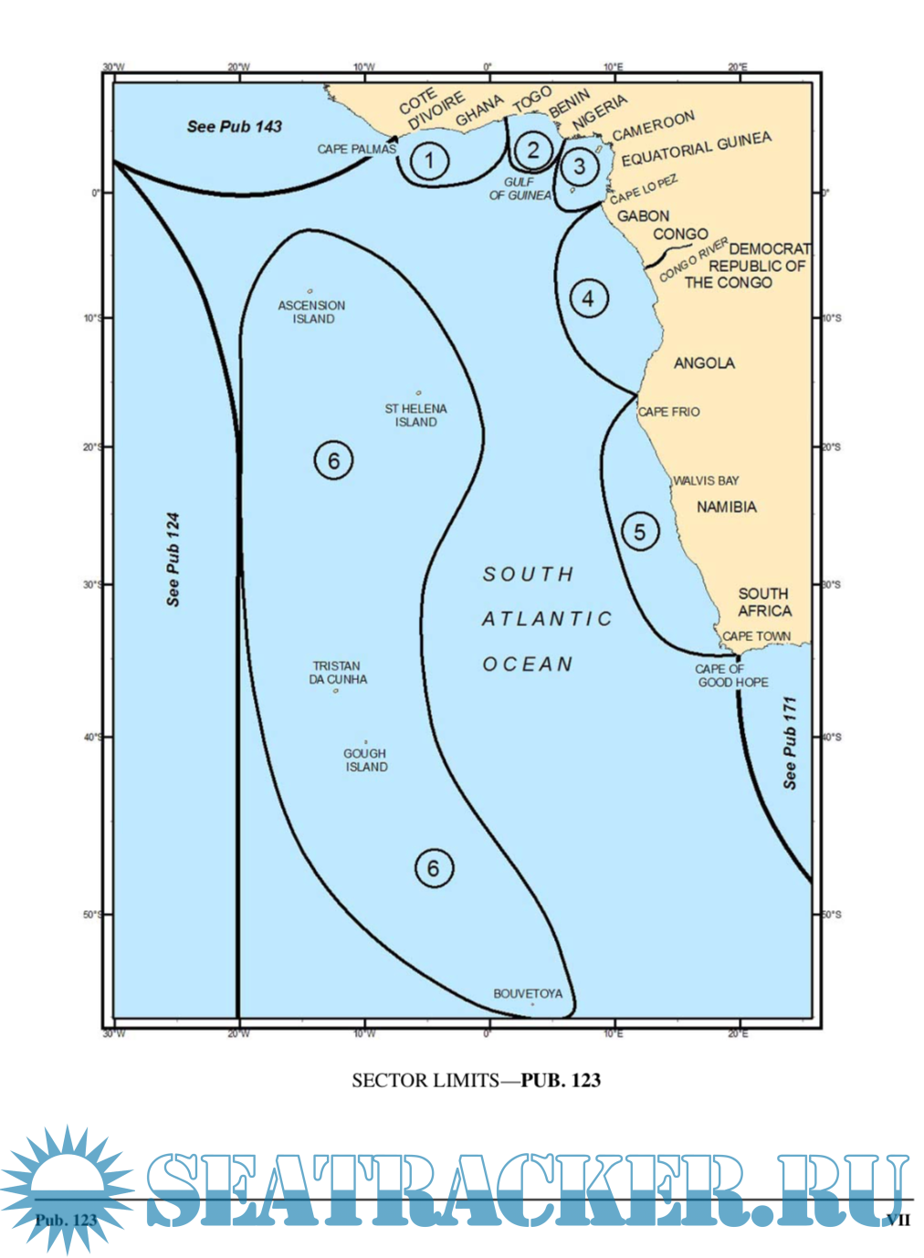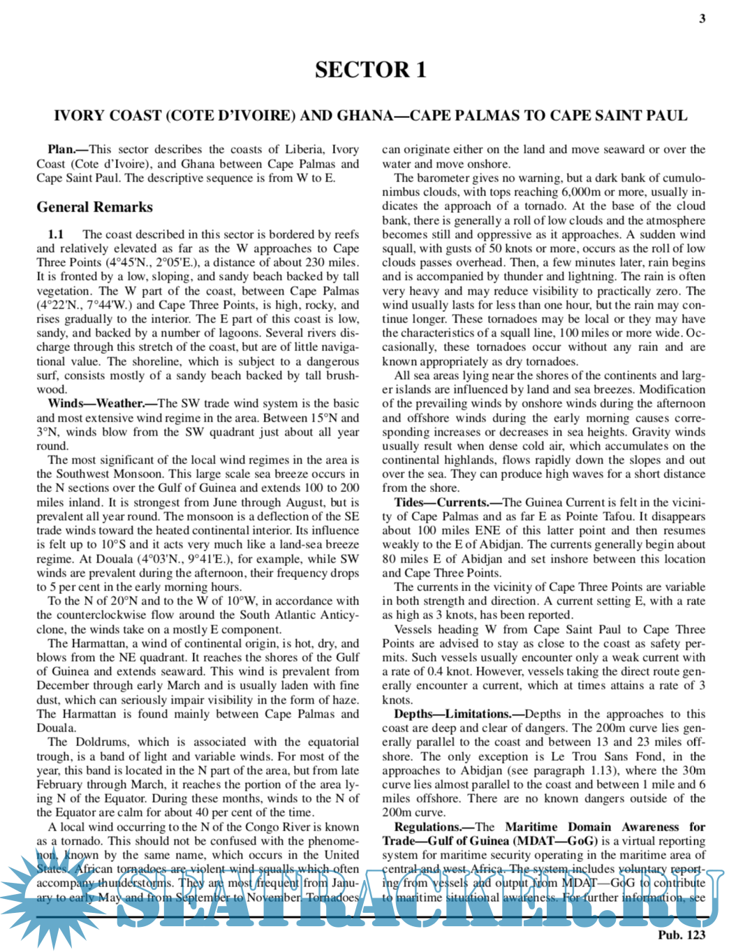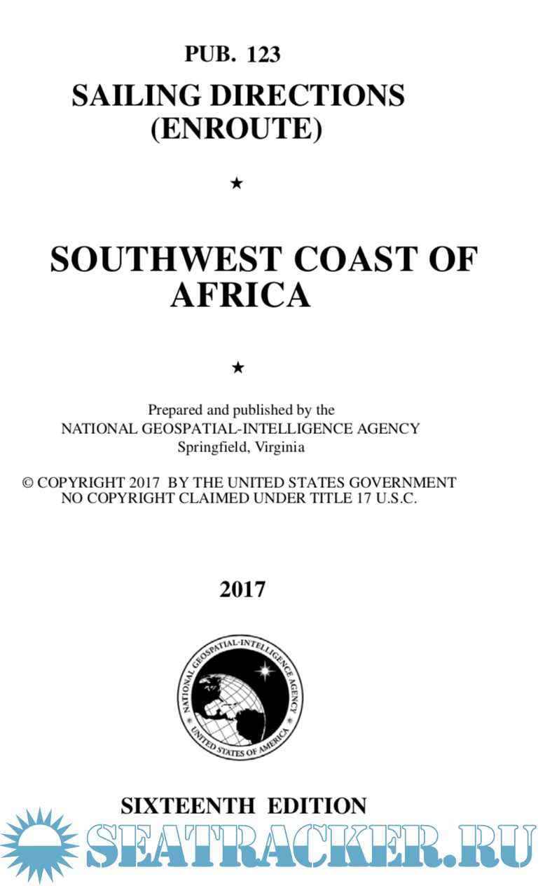 Description: Pub. 123, Sailing Directions (Enroute) Southwest Coast of Africa, Sixteenth Edition, 2017, is issued for use in conjunction with Pub. 160, Sailing Directions (Planning Guide) South Atlantic Ocean and Indian Ocean. The companion volume is Pub. 124.