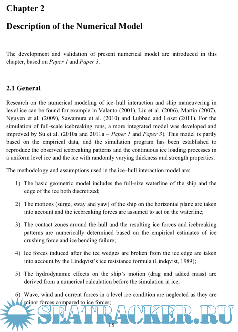 Year: 2011 Language: english Author: Biao Su Genre: Research papers Publisher: Norwegian University of Science and Technology ISBN: 978-82-471-2853-4 Format: PDF Quality: eBook Pages count: 175 Description: Ice loads represent the dominant load for ice-going ships, and it is important to estimate both global and local ice loads on ship hulls. The global ice load governs the ship’s overall performance in ice, and it is an integrated effect of local ice loads over the hull area. Information on the distributions of local ice loads around the hull can be used for more effective design of ice-going ships both in terms of overall operation and from the structural point of view. The present thesis focuses on a numerical model for simulating ice–hull interaction and ship maneuvers in level ice. This model is partly based on the empirical data, by which the observed phenomena of continuous icebreaking can be reproduced. In the simulation of a full-scale icebreaking run, the interdependence between the ice load and the ship’s motion is considered, and the three degree-of-freedom (DOF) rigid body equations of surge, sway and yaw are solved by numerical integration. The thickness and strength properties of the ice encountered by the ship are assumed to be constant or predefined based on the statistical data. Accordingly the global and local ice loads on ship hulls can be obtained in a deterministic or probabilistic way.
