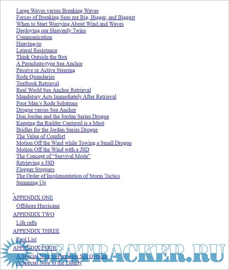 Description: As author remarks "Storms exist. Pretending they don’t or that they will never hit you is both stupid and childish". The purpose of this book is not to encourage ayone to sail into storms, but rather to assist reasonably experienced sailors to survive storms with minimal damage to vessel and crew. Since not all storms can be avoided, the sailor must be properly prepared, instead of fear them. There’s only one way to obtain this offshore calm and self-confidence. It is called seamanship, or common sense based upon experience. It cannot be purchased. Seamanship must be earned over time, and the more seamanship one has, the less fear suffers. A little fear can be useful, but too much can paralyze. The base idea of the book is that a good boat is obviously better than a bad one, but there is no direct relationship between cost and safety. A small, storm-proofed boat can be safer than a large, expensive yacht. In this book the author widely dispenses tips, tricks and rules to make safer the existing boat. Advices covers everything the offshore sailor needs to know about vessel preparation, reducing sail, reefing, towing slowing drogues, deploying a parachute-type sea anchor, from where to step into a life raft, why deploy fenders, what things one must avoid, and ultimately, hanging to a Jordan Series Drogue.