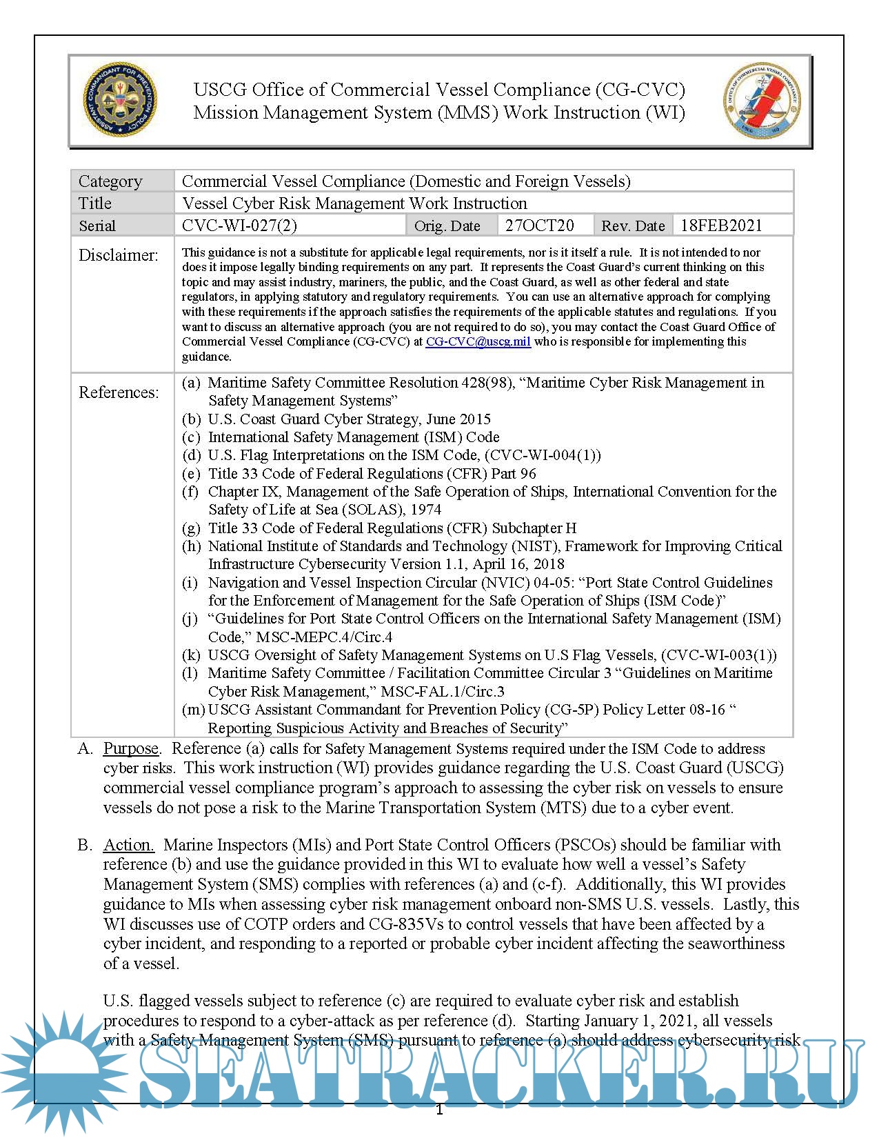 Year: 2021 Language: english Author: USCG Genre: Guide Publisher: USCG Format: PDF Quality: eBook Pages count: 7 Description: As maritime operations become more reliant on the systems integrated through automation, cyber risk is an area of increasing concern in the Marine Transportation System. This matter would eventually be monitored via PSC inspections for both domestic as well as foreign Flag vessels calling US ports. In an effort to address cyber threats in the maritime sector, the US Coast Guard has issued a Guidance Paper to provide guidance to Coast Guard Marine Inspectors and Port State Control Officers for assessing cyber hygiene onboard applicable vessels, as well as compliance options if deficiencies are noted. USCG recognizes that not all shipping companies and ships are alike, and therefore the SMS provides shipping companies the ability to tailor a structured system to address evolving cybersecurity vulnerabilities unique to a company/vessels specific management and operations. If you arrive in the US port with a malfunctioning critical system, you will be required to fix it there and then, be audited, and be able to reassure the PSCO on your next visit that the issue has been rectified. If you cannot do this, your vessel will most probably be detained.