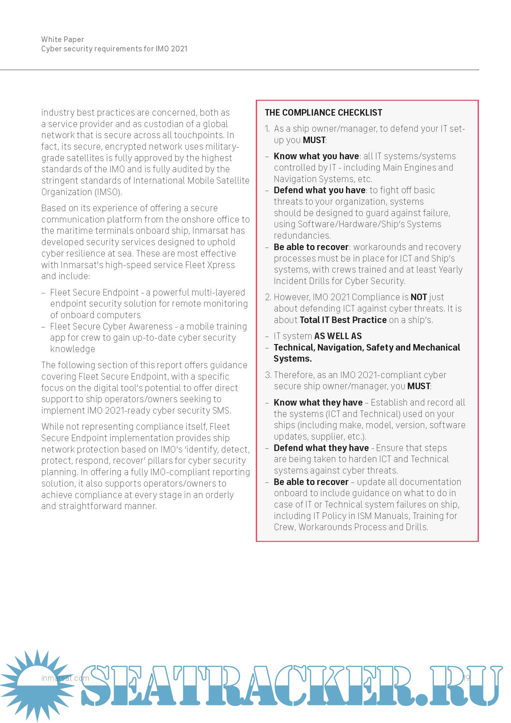 Year: 2020 Language: english Author: INMARSAT Genre: Guide Publisher: INMARSAT Format: PDF Quality: eBook Pages count: 38 Description: Developments in connectivity and the transfer of data in greater volumes between ship and shore continue to bring significant gains for fleet management efficiency and crew welfare, but they also increase the vulnerability of critical systems onboard vessels to cyber attacks. By International Maritime Organization (IMO) resolution, no later than a ship's first annual Document of Compliance audit after 1 January 2021, every Safety Management System must be documented as having included cyber risk management, in line with the International Safety Management Code. The following report offers ship owners and managers guidance covering their responsibilities under the new IMO regime.
