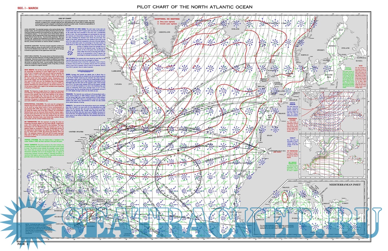 Description: Pilot Charts depict averages in prevailing winds and currents, air and sea temperatures, wave heights, ice limits, visibility, barometric pressure, and weather conditions at different times of the year. The information used to compile these averages was obtained from oceanographic and meteorologic observations over many decades during the late 18th and 19th centuries.