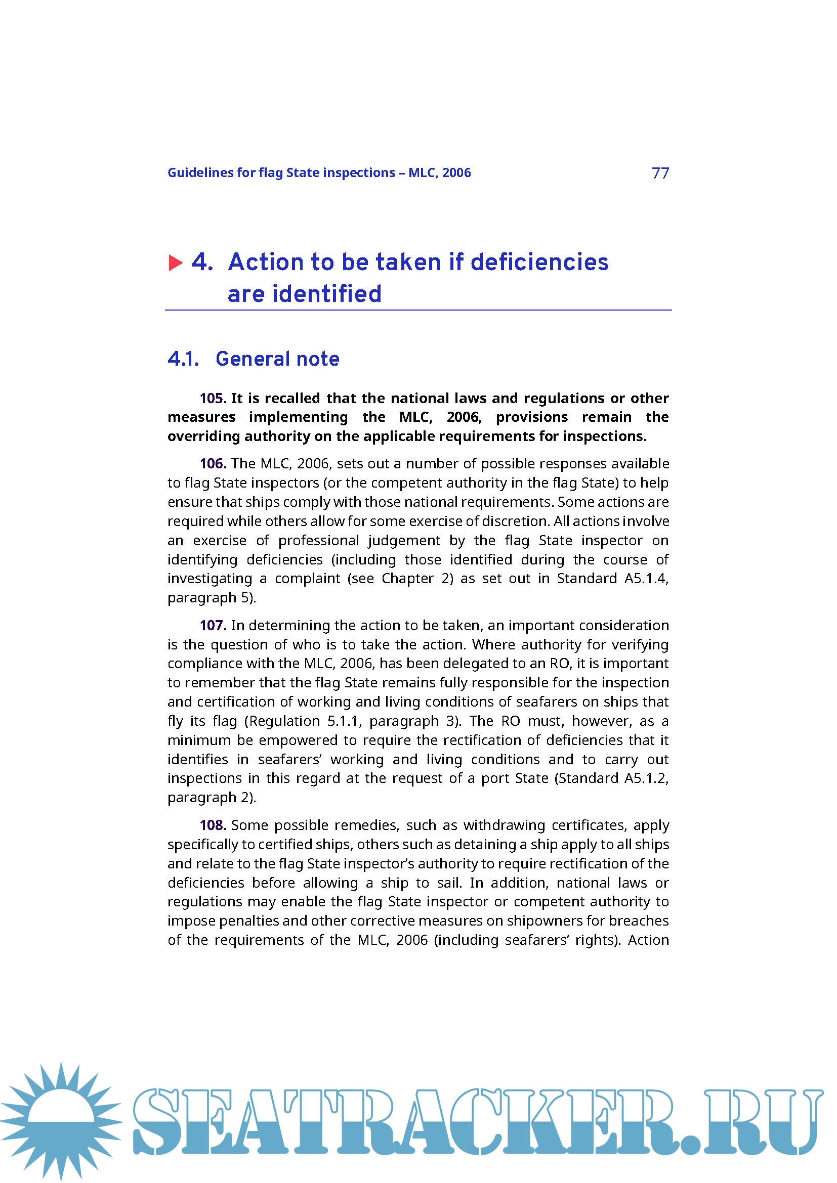The present Guidelines provide practical advice to competent authorities in flag States and to flag State inspectors, or recognized organizations, on how to carry out ship inspections and certifications to verify compliance with the requirements of the MLC, 2006 as implemented nationally. Chapter 1 contains an overview of the special features of the MLC, 2006 and its key concepts. Chapter 2 provides an overview of the procedures for ship inspection and certification, including areas of national flexibility, and processes for responding to complaints. The main inspection tool is provided by Chapter 3, indicating the basic requirements to be complied with, a list of items showing how to check the basic requirements and examples of deficiencies, in connection with these requirements. Chapter 4 provides guidance on actions to be taken when deficiencies are found and when a ship may have to be detained.