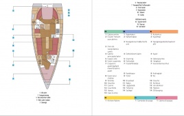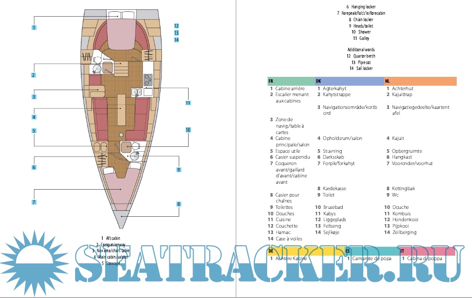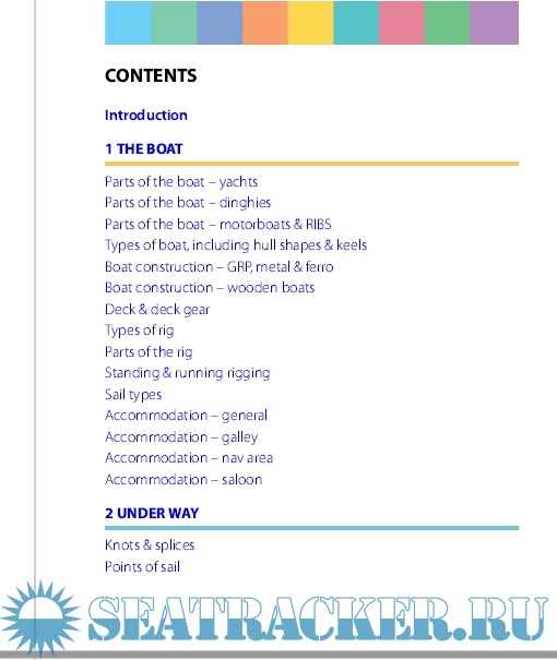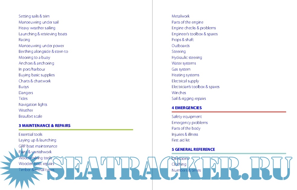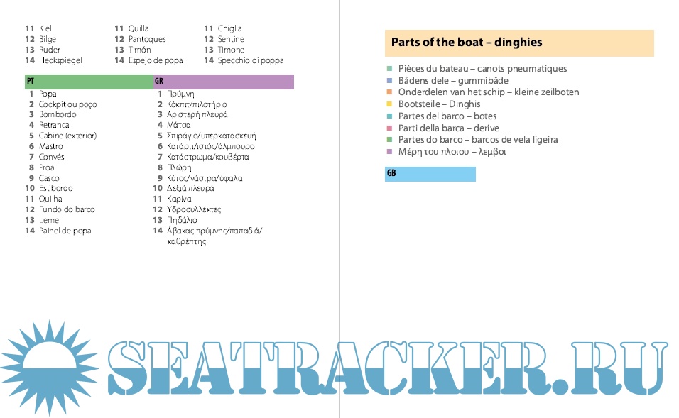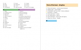 The pocket dictionary is centred around clear, colour, annotated diagrams, such as parts of the rig and engine, in each nautical subject area, and makes it very easy and convenient to translate between nine languages (English, French, German, Dutch, Spanish, Italian, Danish, Portuguese and Greek). The diagrams can easily be used to show someone what is meant (or what is broken!) without having to worry about the language barrier. It covers general terms, such as 'port' and 'starboard', as well as technical words relating to engine and rigging repair and maintenance. Other topics include navigation, weather, seamanship, requesting help, medical emergencies, safety equipment, numbers and time.