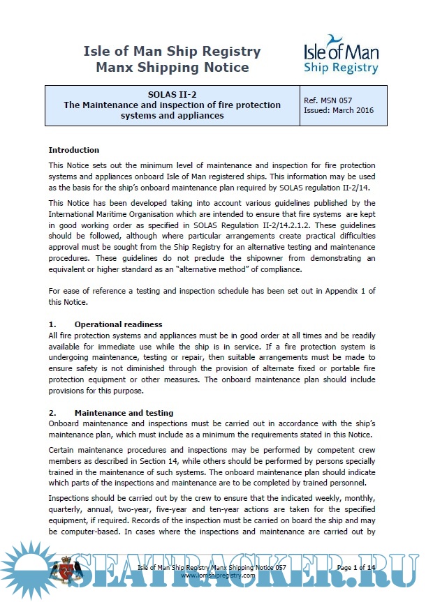 This Notice sets out the minimum level of maintenance and inspection for fire protection systems and appliances onboard Isle of Man registered ships. This information may be used as the basis for the ship’s onboard maintenance plan required by SOLAS regulation II-2/14.