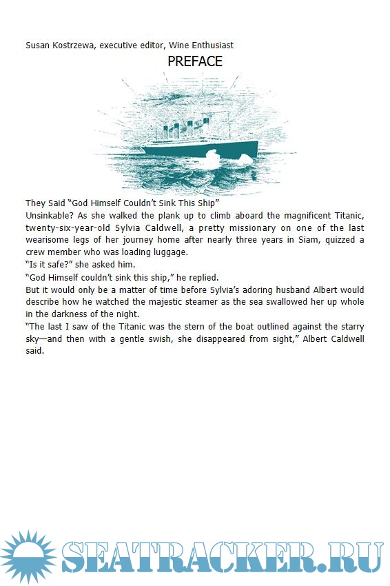 Year: 2019 Language: english Author: Hinke V. Genre: History Publisher: Regnery History ISBN: 1621577295 Format: EPUB Quality: eBook Pages count: 261 Description: “Veronica Hinke has taken a story that we all know so well and interwoven delicious recipes that are historic and old, but classic and worthy of any modern-day table. She has unearthed a vibrant culinary subtext that often left me breathless and dreamy-eyed. She skillfully captures the magical avor of a fascinating era in our history. Two spatulas raised in adulation.” — CHEF ART SMITH, James Beard award winner, Top Chef Masters contestant, former personal chef to Oprah Winfrey April 14, 1912. It was an unforgettable night. In the last hours before the Titanic struck the iceberg, passengers in all classes were enjoying unprecedented luxuries. Innovations in food, drink, and de´cor made this voyage the apogee of Edwardian elegance. Veronica Hinke’s painstaking research and deft touch bring the Titanic’s tragic but eternally glamorous maiden voyage back to life. In addition to stirring accounts of individual tragedy and survival, The Last Night on the Titanic offers tried-and-true recipes, newly invented styles, and classic cocktails to reproduce a glittering world of sophistication at sea. Readers will experience: Recipes for Oysters a` la Russe, Chicken and Wild Mushroom Vol-au-Vents, and dozens of other scrumptious dishes for readers to recreate in their own kitchens A rare printed menu from the last first class dinner on the Titanic Drink recipes from John Jacob Astor IV’s luxury hotels, including the original Martini The true story of “The Unsinkable Molly Brown” An extraordinary eyewitness testimony to Captain Edward Smith’s final moments Intimate and captivating stories about select passengers—from millionaires to third class passengers. Additional info: About the Author Veronica Hinke has been researching Titanic for as long as she can remember. While growing up in northern Wisconsin she often heard tales of “Popcorn Dan,” a man who hauled a horse-drawn popcorn cart through town with a withered arm and was the caretaker of a mansion that was rumored to be haunted. Daniel Coxon was one of the 537 men in third class who drowned aboard Titanic. Hinke has interviewed Coxon’s family members and historians who have studied him. She has also interviewed hundreds of experts on lifestyles, food and beverage for Tribune Media and other news outlets. She maintains a close working relationship with many leading chefs and mixologists around the world. Her annual year-end round-up story for Tribune Media, “The Best Thing I Ate This Year” features 50 food and drinks pros and their local picks. The story annually leads in holiday weekend news traffic and receives hundreds of retweets and Facebook shares. Her “Titanic Cocktails” report for Wine Enthusiast magazine honored the 100 th anniversary of Titanic. For the story, she interviewed Frank Caiafa, The Waldorf Astoria Bar Book, 2016, Penguin; and Toby Maloney, Co- founder, Alchemy Consulting, New York and co-founders of The Violet Hour, a prohibition era-style drinks venue in Chicago. Hinke also worked closely with RMS Titanic to obtain the data on liquor, beer, spirits and wine remnants pulled from Titanic debris sites. Each bottle provides a peek into Titanic’s history and helps to demystify what life was like for people in all three classes. “Titanic Cocktails” achieved considerable reach and continues to generate interest. The 360-word story was blogged by the Village Voice and spotlighted by New York Times “What We’re Reading” editors.