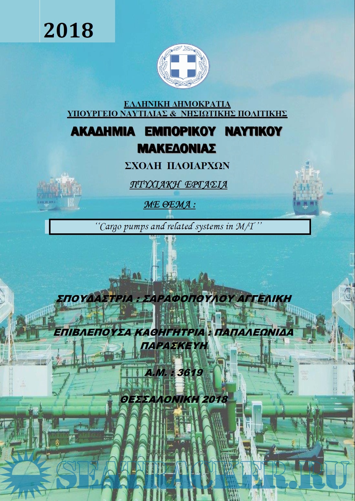 Description: This project attempts to identify the types of pumps established on ships, i.e. cargo-oil- pumps (C.O.P.) and related systems (such as: inert gas pumps, tank cleaning pumps e.t.c.) that are used mostly in tanker vessels and their functions. Additionally, the process of the operation of pumps is presented, the sealing, bearings and drive transmission that they are equipped with. A detailed reference is made to other systems that are located in M/T vessels, such as pumps in ship propulsion and in ship electric power production systems (Fire pumps, Bilge pumps, and hot water circulation pumps e.t.c.). Moreover, this dissertation offers a description of the A.U.S. system, Framo Hydraulic Cargo Pumping System and standards by OCIMF (Oil Companies International Marine Forum) and ISGOTT (International Oil Tanker and Terminal Safety Guide) of how pumproom, cargo lines and other lines on deck and manifolds should be constructed and arranged. Also the matter of responsibility at cargo handling in pumps is discussed, as well as the pump wear and maintenance. In conclusion there is a short reference to how cargo handling operations are conducted with cargo pumps and other systems (loading and discharging) in tanker vessels.