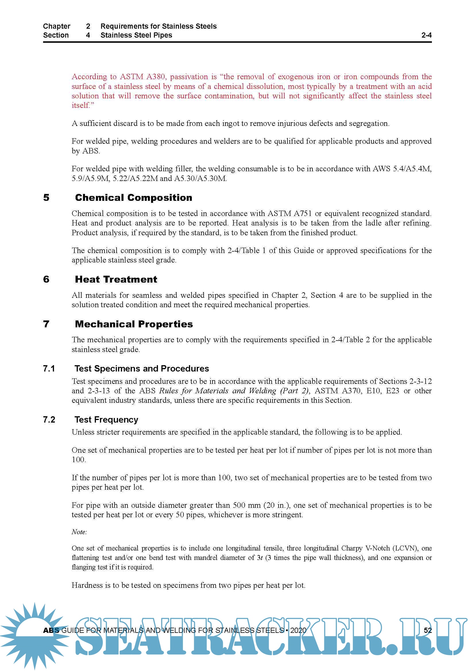 Year: 2020 Language: english Author: ABS Genre: Guide Publisher: ABS Format: PDF Quality: eBook Pages count: 151 Description: This Guide has been developed to give minimum requirements for properties, manufacturing processes and fabrication techniques applicable to common types of stainless steels used in the marine and offshore industries. This Guide covers four chapters pertaining to materials and welding for stainless steels: ● Chapter 1 contains general requirements for austenitic and duplex stainless steels. ● Chapter 2 contains the requirements for rolled materials, forgings, castings, pipes and stainless steel clad plates. ● Chapter 3 contains the requirements for various types of welding filler metals and the applicable base metals. ● Chapter 4 contains the requirements for welding procedures and welder qualification, production welding and fabrication, fabrication verification and nondestructive testing of production welds. The general requirements and practices in this Guide provide qualification of materials and quality control in production and fabrication from raw materials to the end use in ships, offshore units, pressure vessels, piping systems or components.