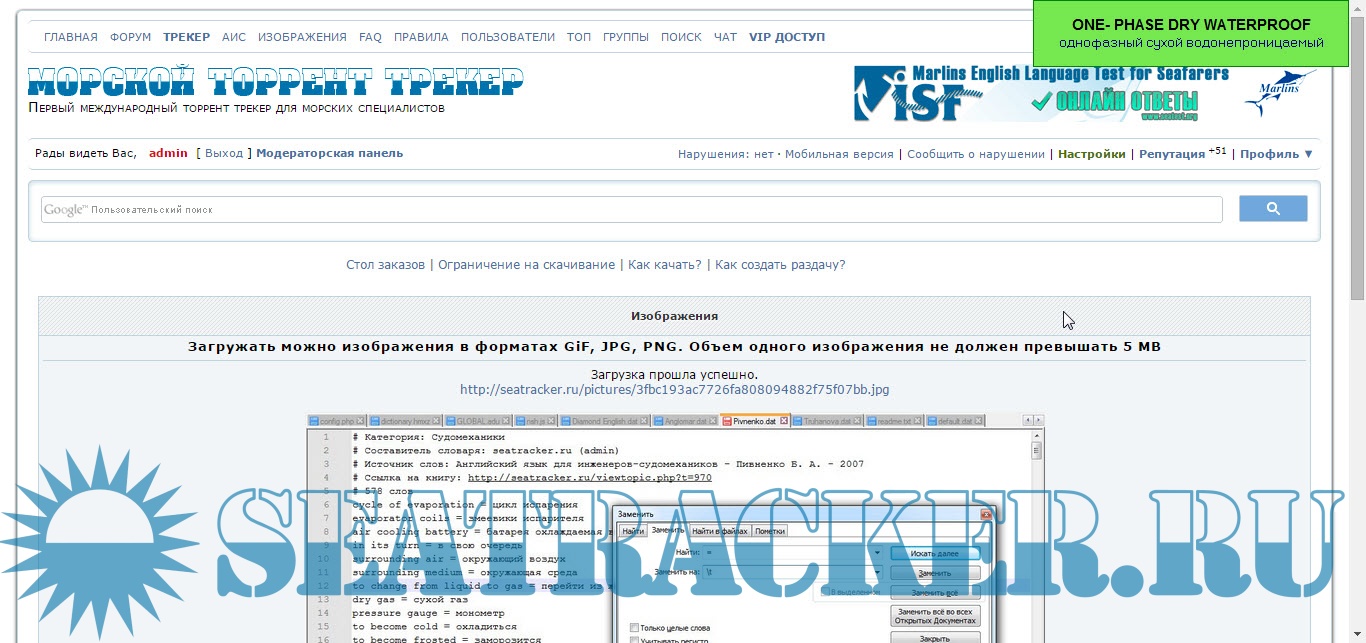 Год выпуска: 2015 Версия: 1.3 Разработчик: AVT LAB Платформа: PC (Windows) Совместимость с Windows7: да Системные требования: Minimal Язык интерфейса: только русский Таблэтка: Не требуется Описание: Наткнулся на интересную программу, которая позволяет легко и непринужденно заучивать английские морские технические термины. Сама программа представляет из себя окошко (слово-перевод), которое можно разместить в любом месте экрана. У меня было три текстовых словарика для судоводителей, судомехаников и электромехаников (есть в этой раздаче), которые составлял давно еще в мореходке, поэтому я их быстро перегнал в эту программу. Помимо всего этого любой желающий может создать свой личный словарь: 1. Понадобится Блокнот или Notepad++ (более удобен, т.к может потребоваться смена кодировки файла на ANSI) 2. Открываем блокнот и вбиваем туда слова в таком формате # Комментарий 1 # Комментарий 2 # количество слов слово перевод 3. Стоит обратить внимание на то, что между словом и переводом используется символ табуляции. В Notapad++ можно легко это сделать через массовую замену как на скрине 4. Если словарь не открывается, то в Notepad++ нужно преобразовать кодировку файла в ANSI 5. Сохраняем файл в папку Dict, меняем txt расширение на dat Доп. информация: Более подробно в видео: http://www.youtube.com/watch?v=oPhwlEm67EI Дополнительные словари на сайте разработчика: http://avt-lab.ru/dictionary.htm