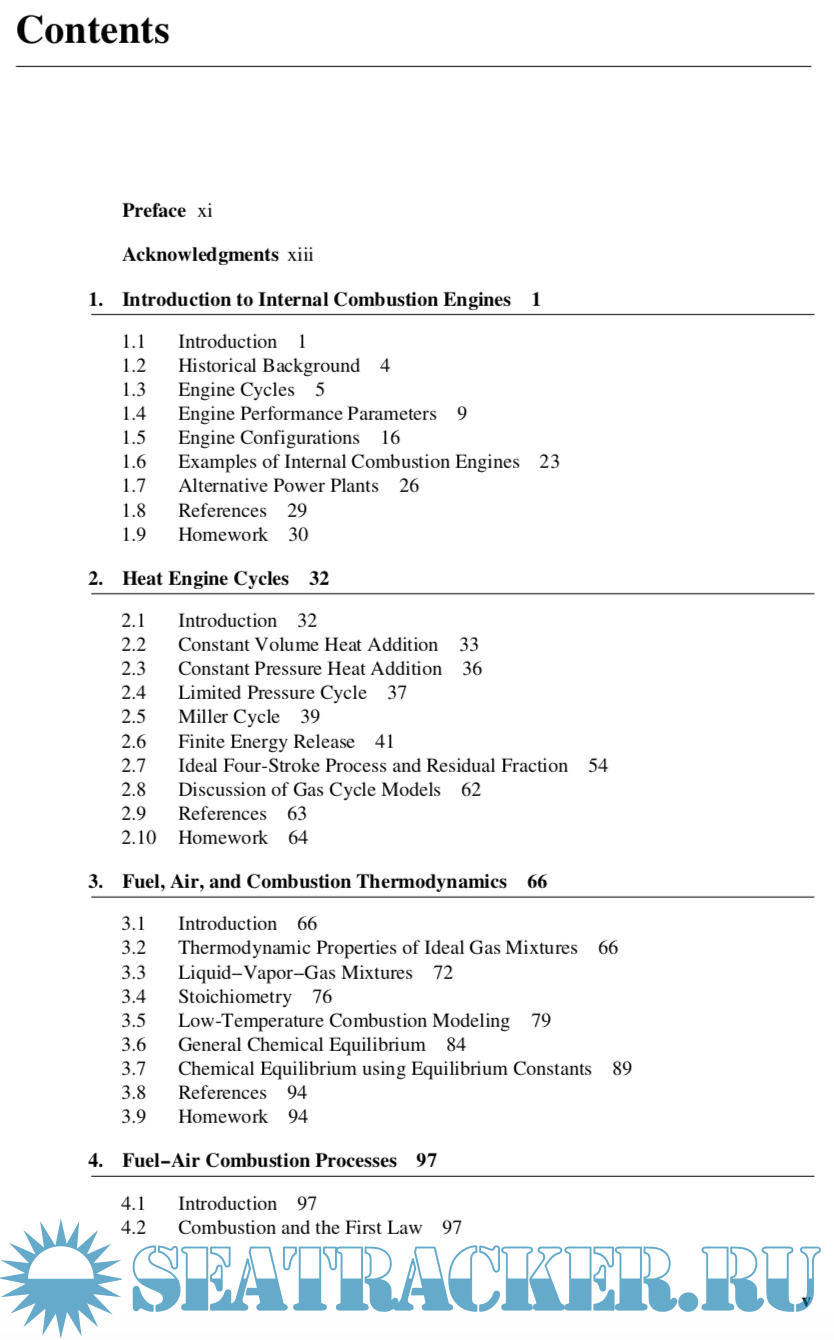 This third edition builds upon the foundation of the second edition. The major changes are the adoption of the programming software MATLABR for the examples, and chapter reorganization for a greater emphasis on combustion. The content changes include addi- tional topics on heat and mass loss in finite heat release models, thermodynamic properties of reacting mixtures, two-zone burn models for homogeneous mixtures, exhaust blowdown modeling, diesel fuel injection, NO