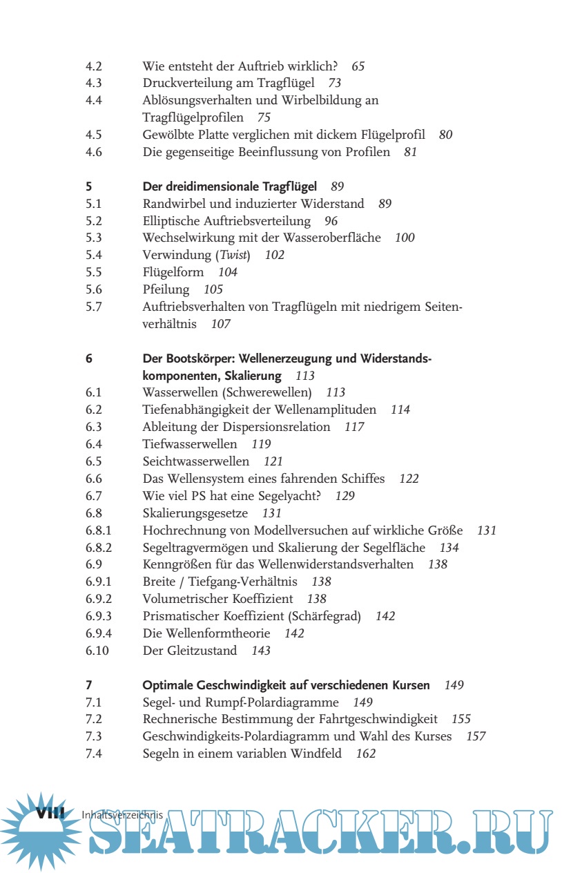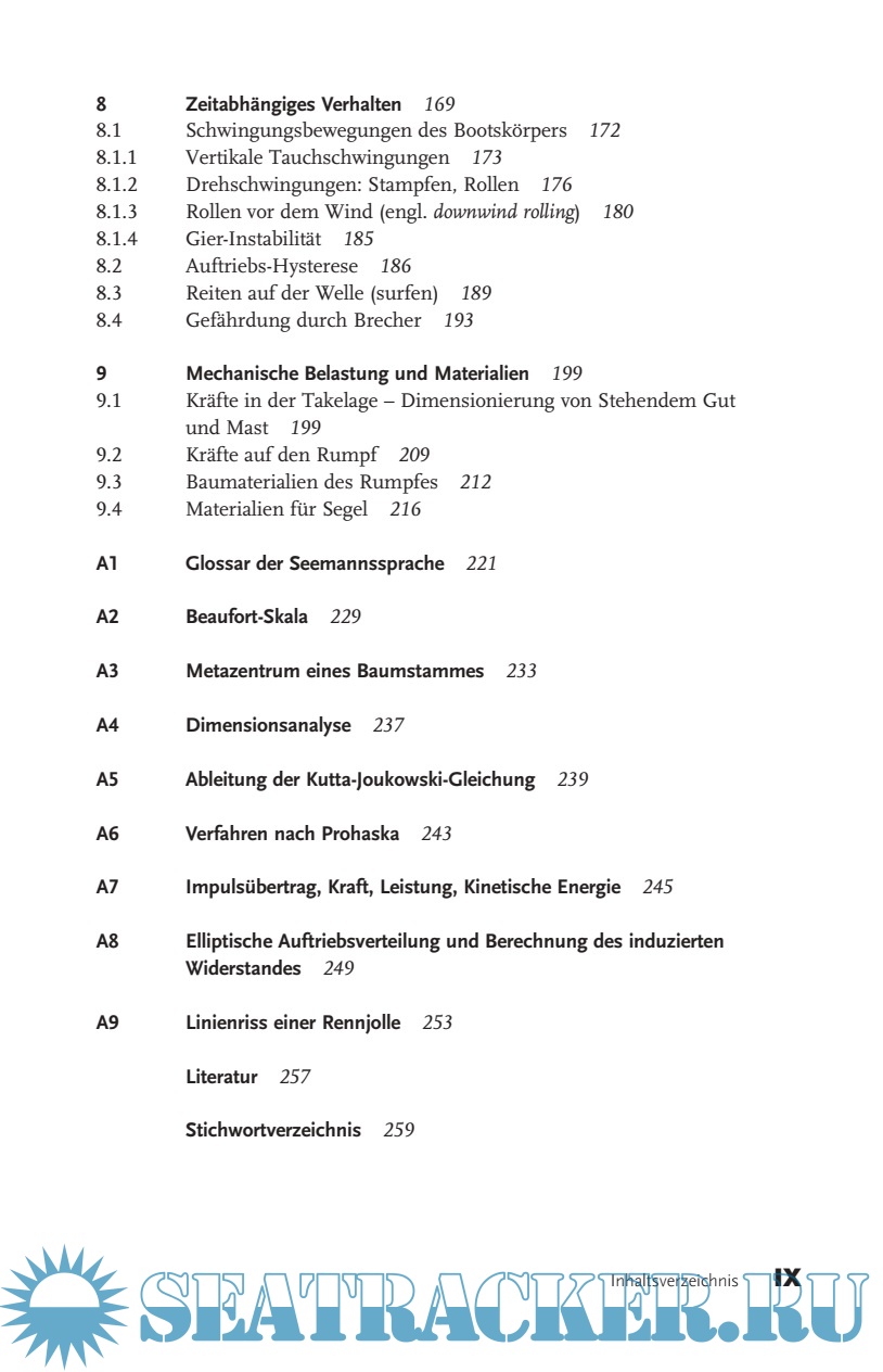 »Physik des Segelns« führt zunächst in die einfachen Grundsätze und Bedingungen des Segelns ein, wie beispielsweise das Kräftegleichgewicht während der Fahrt. Anschließend wird aus den Eigenschaften von Luft und Wasser und den dynamischen Grundgleichungen das Entstehen dieser Kräfte dargelegt. Das Buch räumt mit verbreiteten falschen Vorstellungen auf und schreitet systematisch von der Betrachtung zweidimensionaler Phänomene zu dreidimensionalen Phänomenen voran. Von Erscheinungen innerhalb der Medien Luft und Wasser geht es weiter zu den Erscheinungen an ihrer Grenzfl äche, den Schwerewellen des Wassers und dem damit verbundenen Widerstand. Mit der Kenntnis aller Beiträge zur Vortriebsleistung wird erläutert, wie sie aufeinander abgestimmt werden müssen, um ein optimales Segeltempo zu erreichen. Abschließend werden zeitlich veränderliche Phänomene wie Manöver und das Arbeiten des Bootes im Seegang betrachtet, und die Materialfestigkeit von Takelage und Rumpf diskutiert.