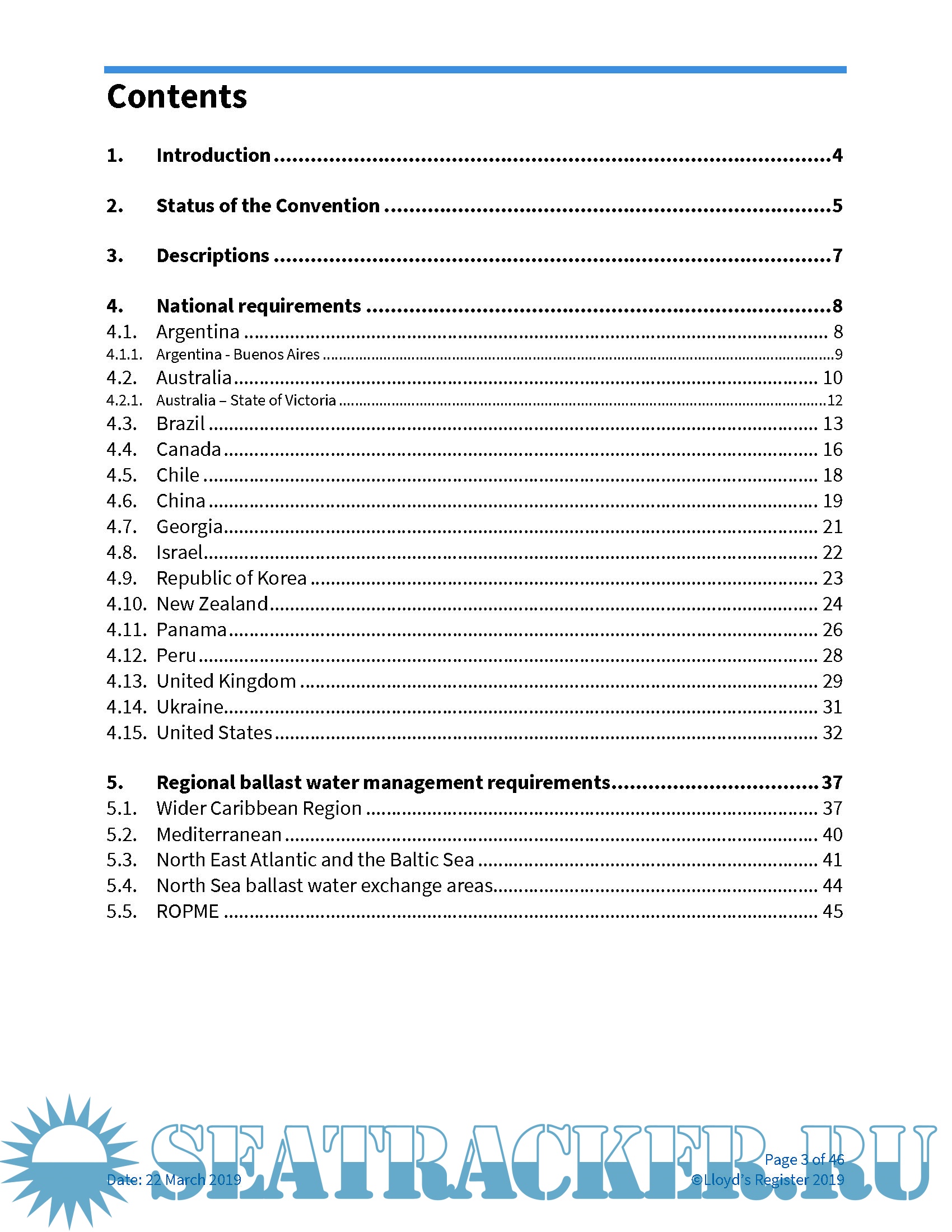 Year: 2019 Language: english Author: Lloyd's Register Format: PDF Quality: eBook Pages count: 46 Description: This document contains a synopsis of a number of known national, regional and local ballast water management regulations and requirements. The information here is an overview of the regulations and requirements to the best of our knowledge at the time of writing, but may not be an exhaustive list. Individual country authorities should be consulted before entering their jurisdiction, to ensure compliance with any relevant ballast water management regulations. In addition, the complete text of each regulation referenced in this document should be consulted for full details. .