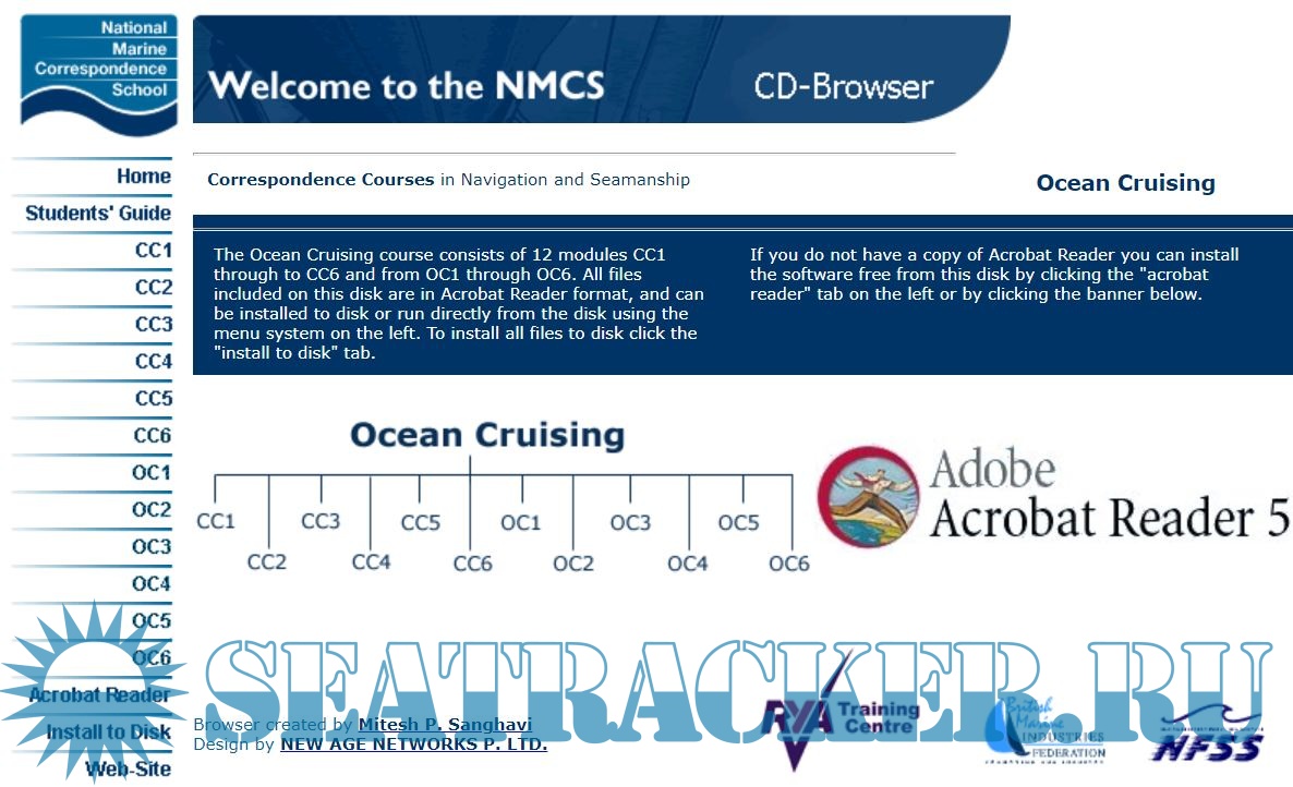 The Ocean Cruising course consists of 12 modules CC1 through to CC6 and from OC1 through OC6. All files included on this disk are in Acrobat Reader format, and can be installed to disk or run directly from the disk (main.html) using the menu system on the left.