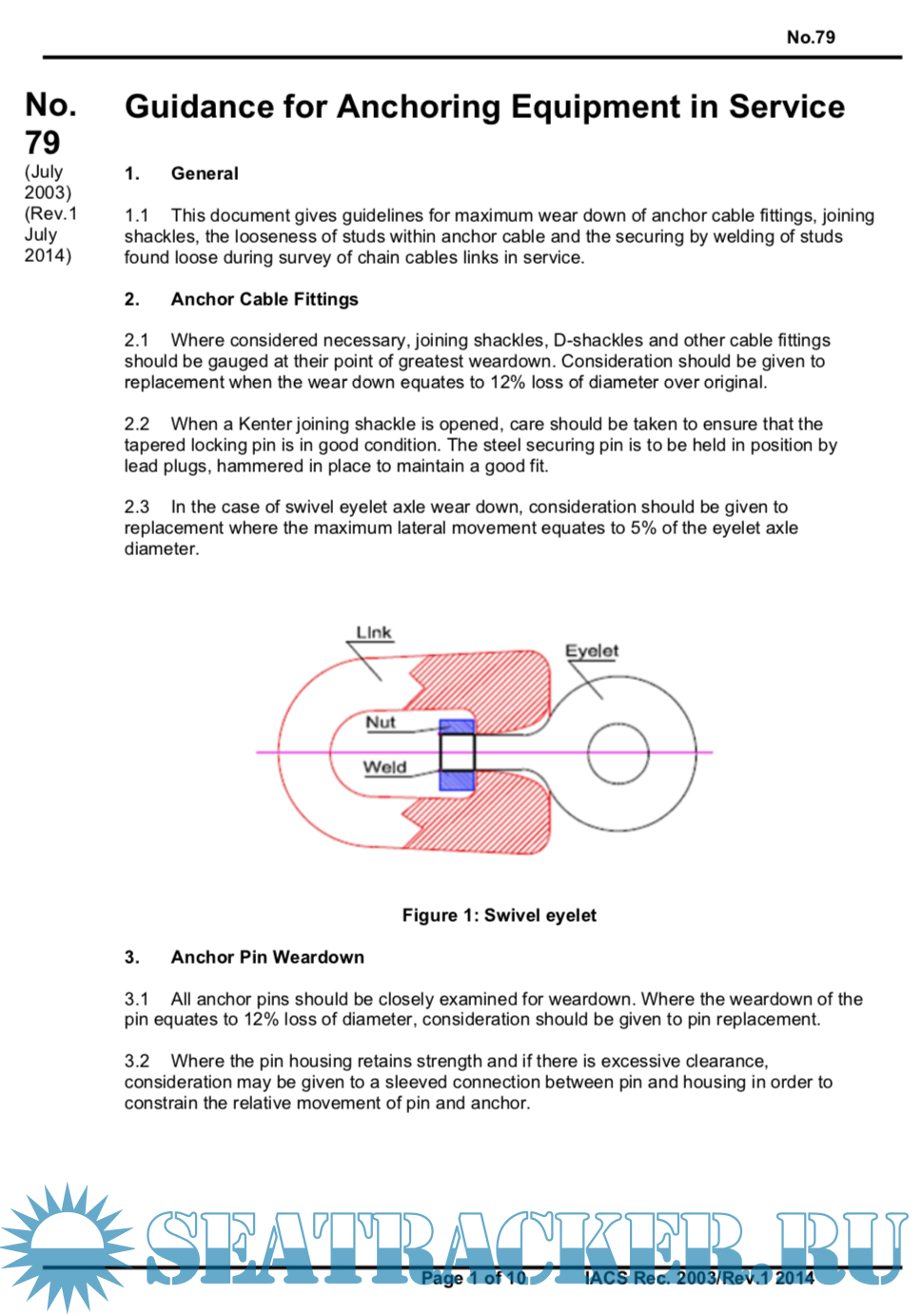 Year: 2014 Language: english Author: IACS Genre: Guide Publisher: IACS Format: PDF Quality: eBook Pages count: 10 Description: This document gives guidelines for maximum wear down of anchor cable fittings, joining shackles, the looseness of studs within anchor cable and the securing by welding of studs found loose during survey of chain cables links in service.