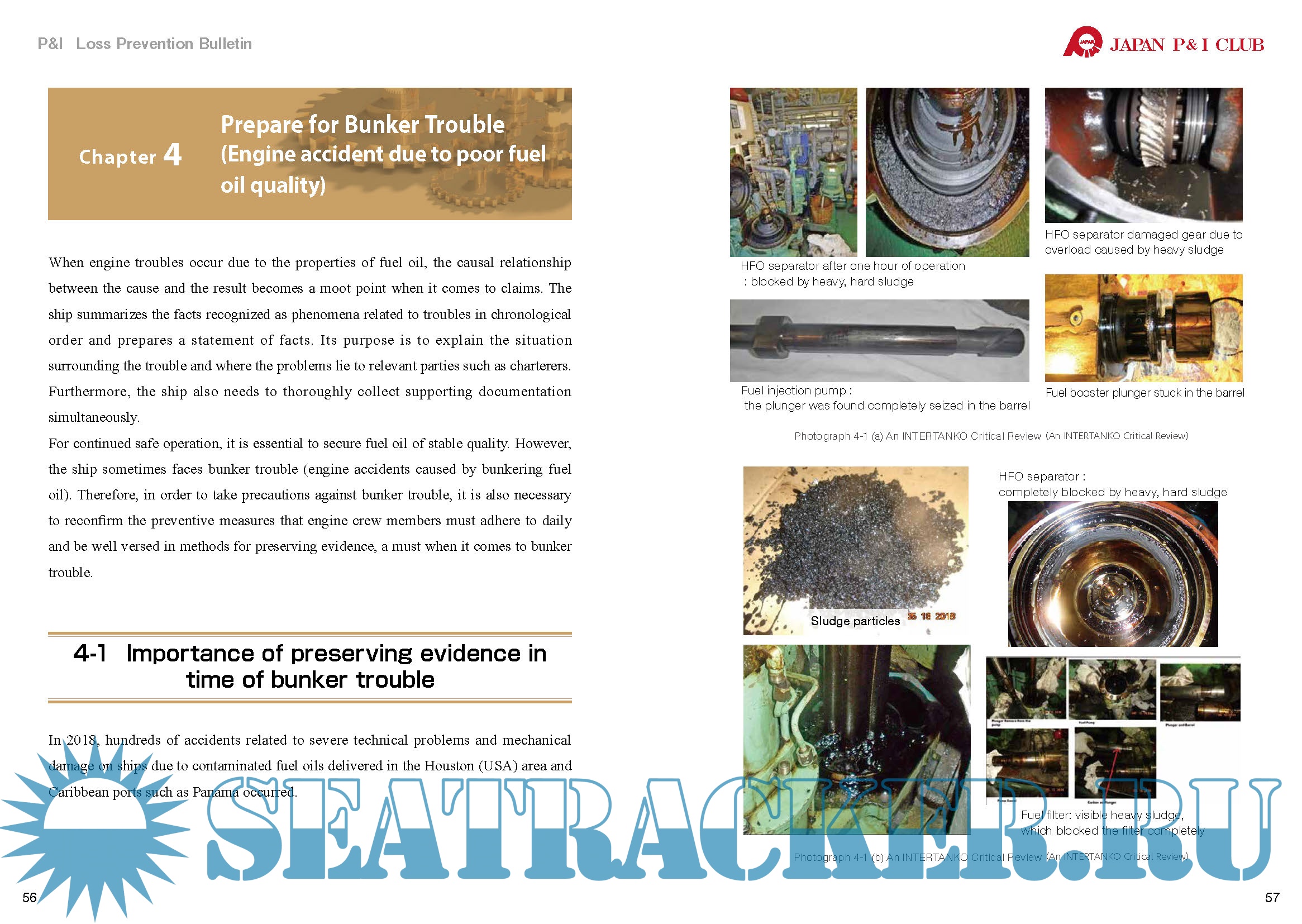 Year: 2020 Language: english Author: Japan P&I Club Format: PDF Quality: eBook Pages count: 140 Description: In this guide “Tips for Effective Engine Management and Maintenance” we have included all of the key elements taken from our open seminars that were held in 2019. When focusing on the root causes of a ship’s machinery failure and incidents, it appears that most cases are the result of management problems regarding oils (fuel oil and lubricating oil) and inspection/repair/maintenance work that was not properly performed. However, the engineers and their crewmembers in the engine department tend to pursue the cause as to whether there is any abnormality regarding mechanical/ electrical engineering integrity and soundness in design/manufacturing, such as whether the engine machinery/equipment itself is working and running normally or not. Regrettably, it is often the case that reoccurrence preventive measures, such as those mentioned above, tend to get neglected or forgotten.