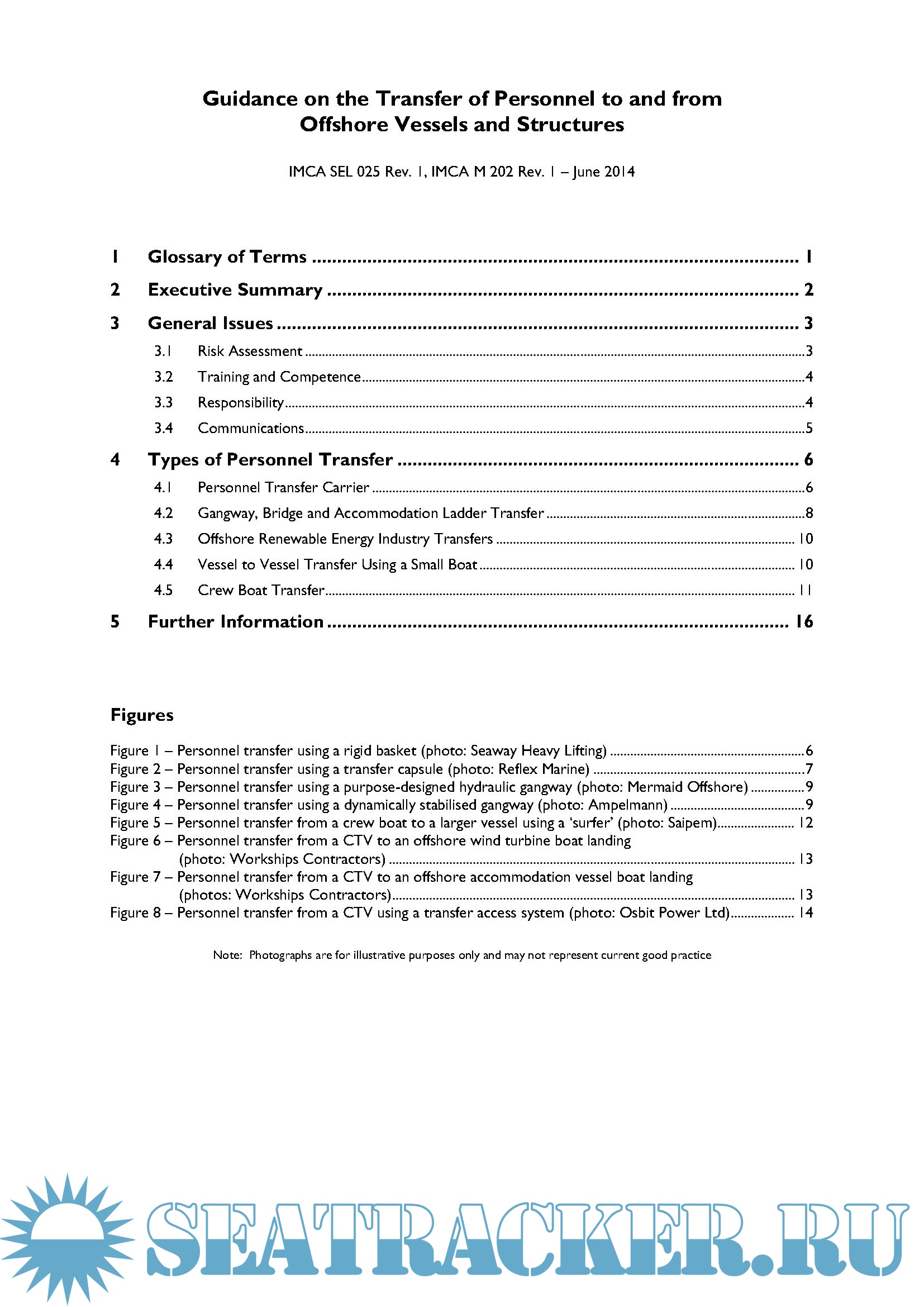 Year: 201X Language: english Author: IMCA Genre: Guide Format: PDF Quality: eBook Pages count: 20 Description: One of the activities specific to offshore operations is the transfer of personnel between vessels and other offshore structures. Such transfers can include movements of personnel at crew change and shift change from vessel to vessel and also between vessels, offshore structures, barges and crew boats as well as to and from the quayside. Within the offshore industry (particularly in the offshore renewable energy industry), there has been an increase in the requirement for the transfer of personnel to offshore vessels and structures, with this trend set to continue. Personnel transfers in the offshore renewable energy industry primarily involve transfer to and from vessels of 10m to 30m in length, operating independently from a mother vessel or from a port. This document is intended to provide guidance for the offshore industry on the safe transfer of personnel at sea. It covers risk assessment, training and competence, responsibility, equipment and communications, and focuses on the main methods of personnel transfer between vessels, offshore structures and the quayside. The primary methods of personnel transfer covered are: ♦ personnel transfer carrier; ♦ gangways, bridge or accommodation ladders, including motion-compensated hydraulic gangways; ♦ small boat or launch; ♦ larger crew boat or support vessel; ♦ mating ‘surfer’ structures allowing personnel to transfer safely. For each case, the document covers the main safety issues and gives some information about the specialist equipment that may be involved, such as ‘surfers’, as well as special duties or responsibilities of personnel involved, particularly with regard to communications. Personnel transfer by helicopter is a separate subject adequately addressed elsewhere and is not covered in this document.