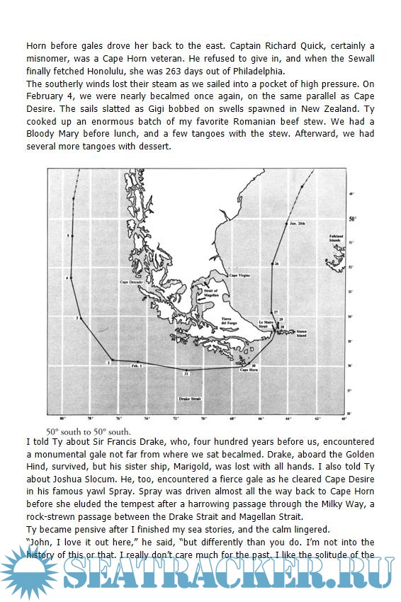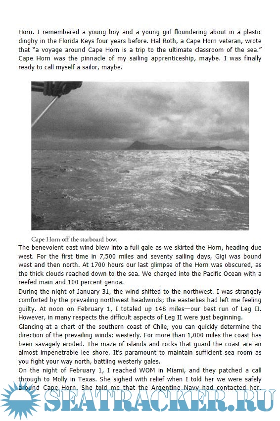 Description: Legendary account of the author's voyage around Cape Horn in a 32-foot sailboat, sailing east-to-west (thus the Horn is to starboard, or on the right). This is a notoriously difficult and dangerous passage, especially in a boat this size.