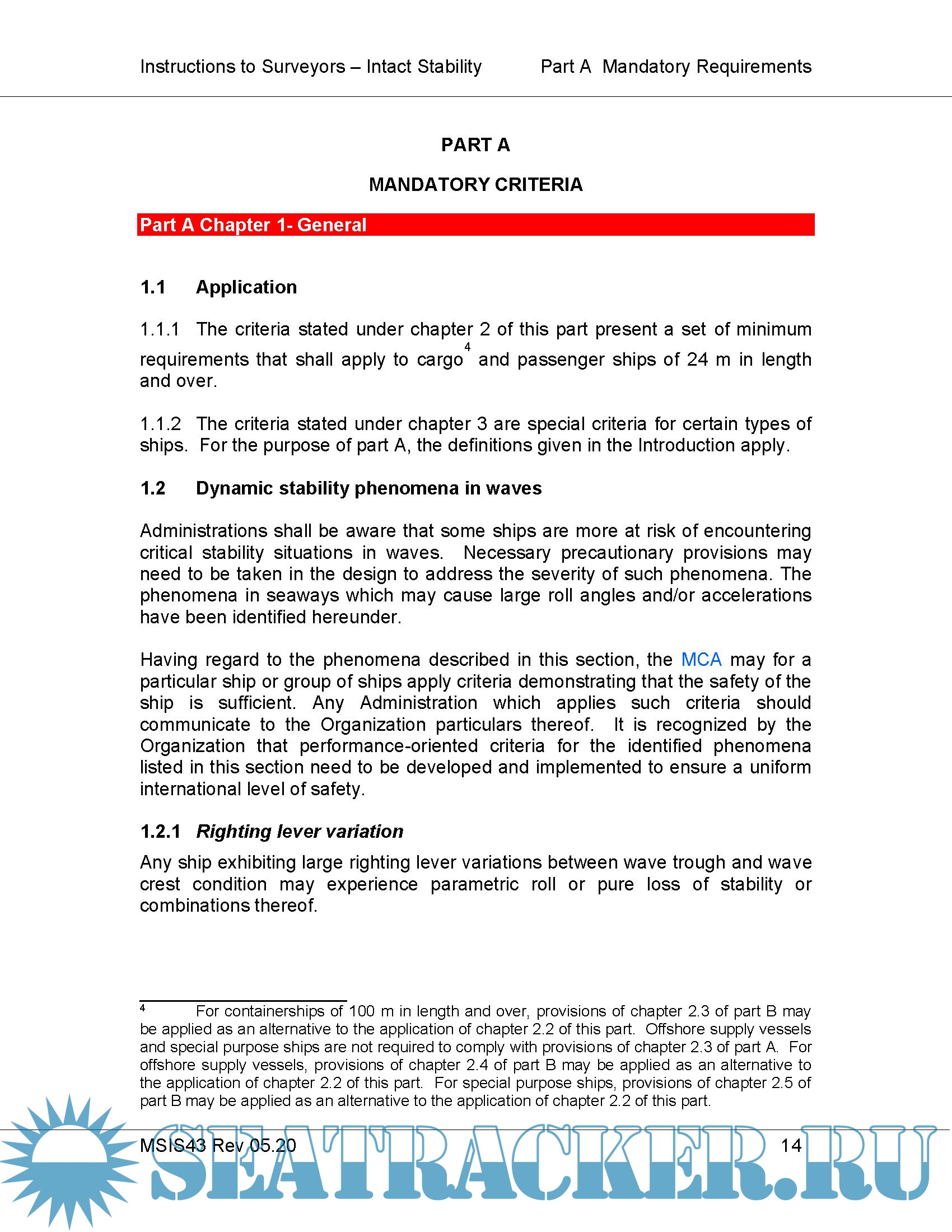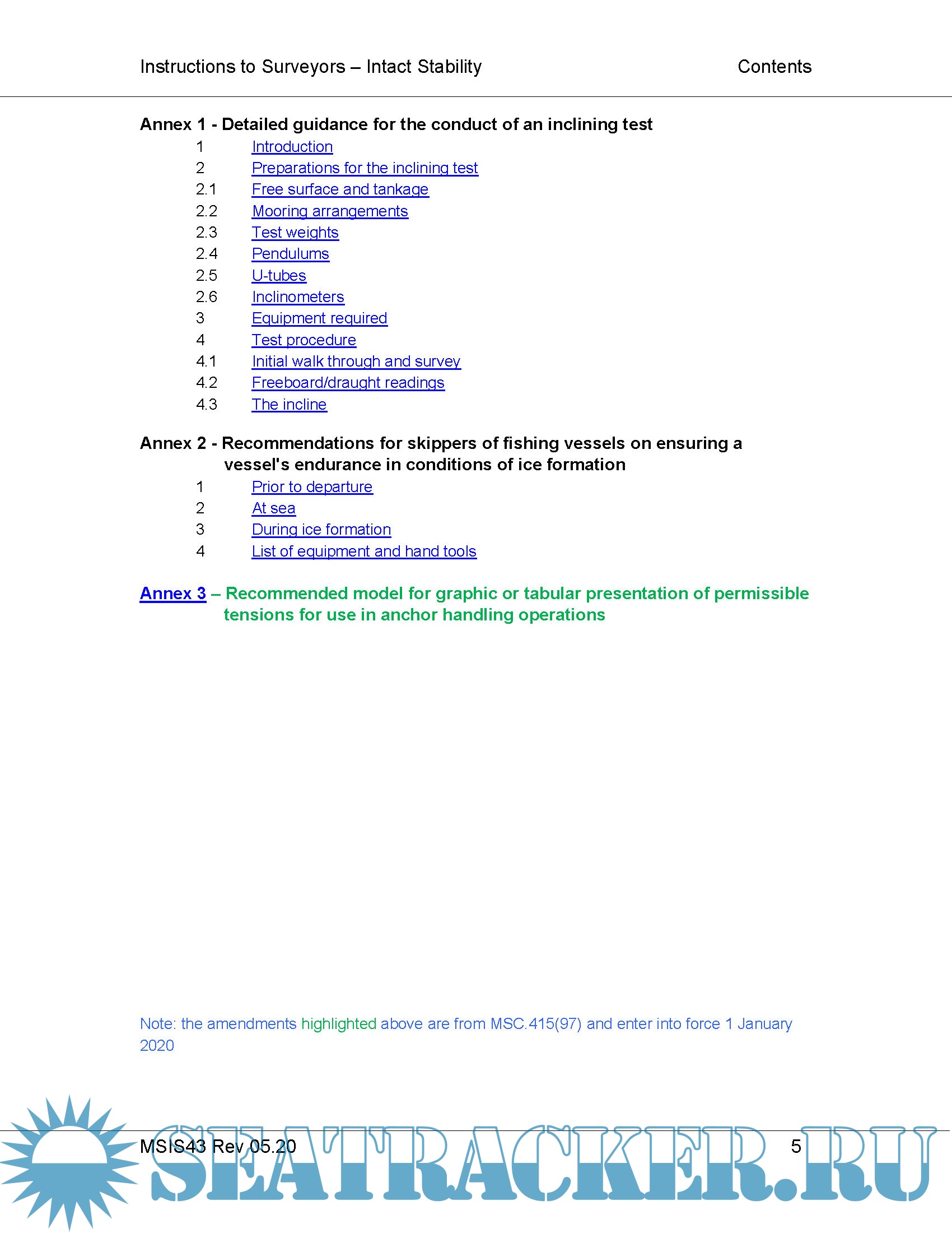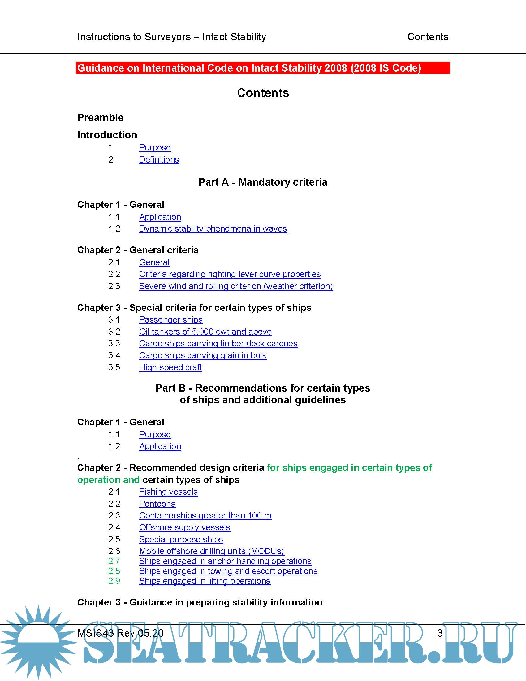 Year: 2020 Language: english Author: MCA Format: PDF Quality: eBook Pages count: 160 Description: INSTRUCTIONS FOR THE GUIDANCE OF SURVEYORS ON INTACT STABILITY IMO 2008 IS CODE & Explanatory Notes Rev 05.2020 This publication includes the full text of the IMO 2008 Intact Stability (IS) Code1 which entered into force for applicable ships with keels laid on or after December 5, 20082 and the associated Explanatory Notes3. The text has been updated to show various subsequent amendments introduced by Resolutions MSC.319(89), MSC.389(95) and MSC. 415(97) These text amendments are highlighted, and notes indicate their various dates of entry into force as appropriate. MCA Guidance Notes or additions/explanations to the original text are shown in blue font as appropriate. The main chapter headings are hyper-linked in the contents for ease of reference The mandatory regulations in the Introduction and Part A are shown in black Ariel 12 font and the recommended provisions in Part B are shown in black Ariel 10 font. The Explanatory Notes are shown in red Ariel 10 font after the Code itself.