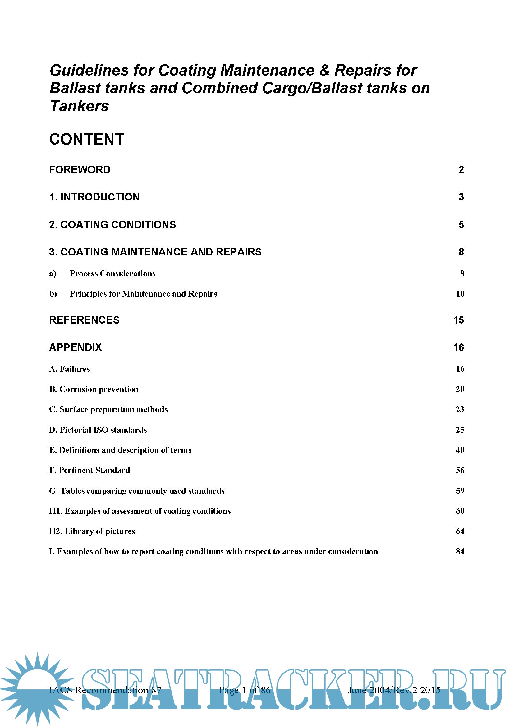 Year: 2015 Language: english Author: IACS Format: PDF Quality: eBook Pages count: 88 Description: These guidelines focus on the survey, assessment, maintenance and repair of coatings in ballast tanks or combined cargo/ballast tanks. This publication is a guide to the survey, maintenance and repair of coatings in ballast tanks or combined cargo/ballast tanks. It has been developed to assist with maintaining, or restoring, good coating condition. Published Date: Revision 2. May 2015