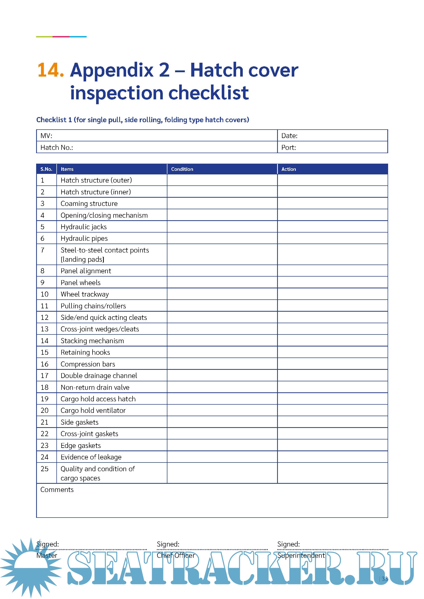 resulting from hatch cover defects. Appendices are included which provide checklists for routine operation, inspections,