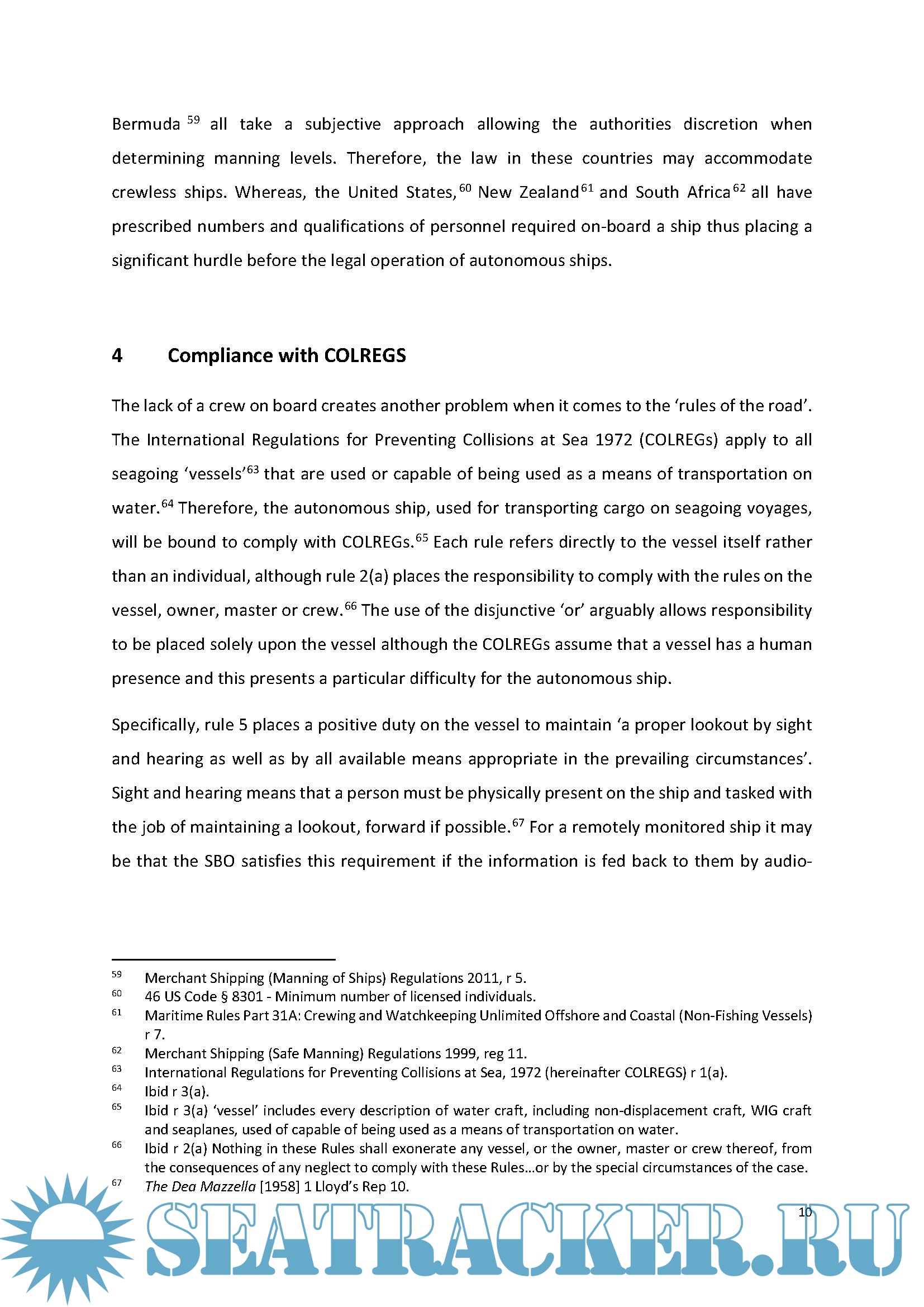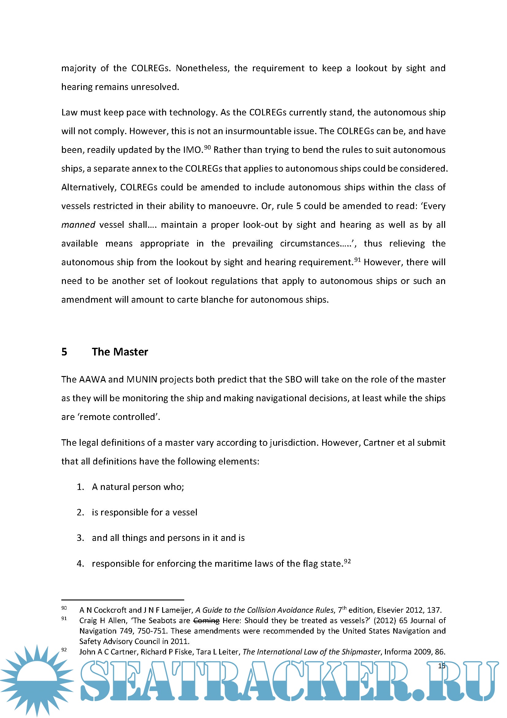 This article, without assessing the desirability of such ships, considers the legal position for a completely unmanned ship3 and whether such a ship can provide the functional equivalents of a crew, master, and pilot that will allow an autonomous ship to comply with existing international and domestic maritime laws. In order to determine what criteria the autonomous ship will need in order to comply, the article considers where the law demands a human presence on-board a ship. In particular, the article considers how the autonomous ship can comply with seaworthiness obligations, safe manning levels, the duties of the shipmaster, and compulsory pilotage.