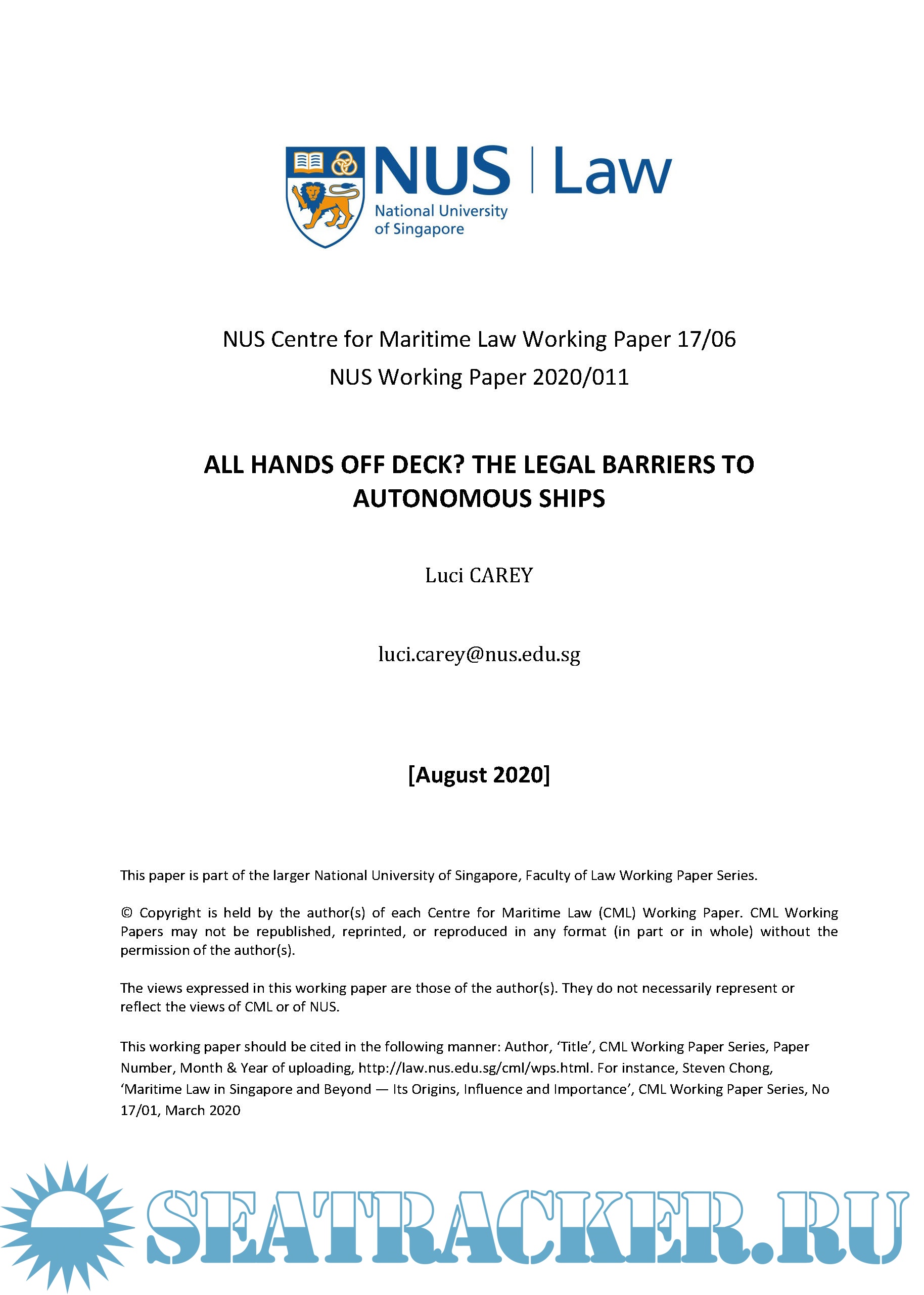 Description: Autonomous or unmanned ships will soon become a reality. This will cause significant disruption to current maritime legal regimes. International maritime law has proved flexible enough to accommodate technological developments, from sail to steam to containerisation, but has evolved over centuries assuming the presence of an onboard crew. This assumption creates some peculiar issues for a crewless ship.