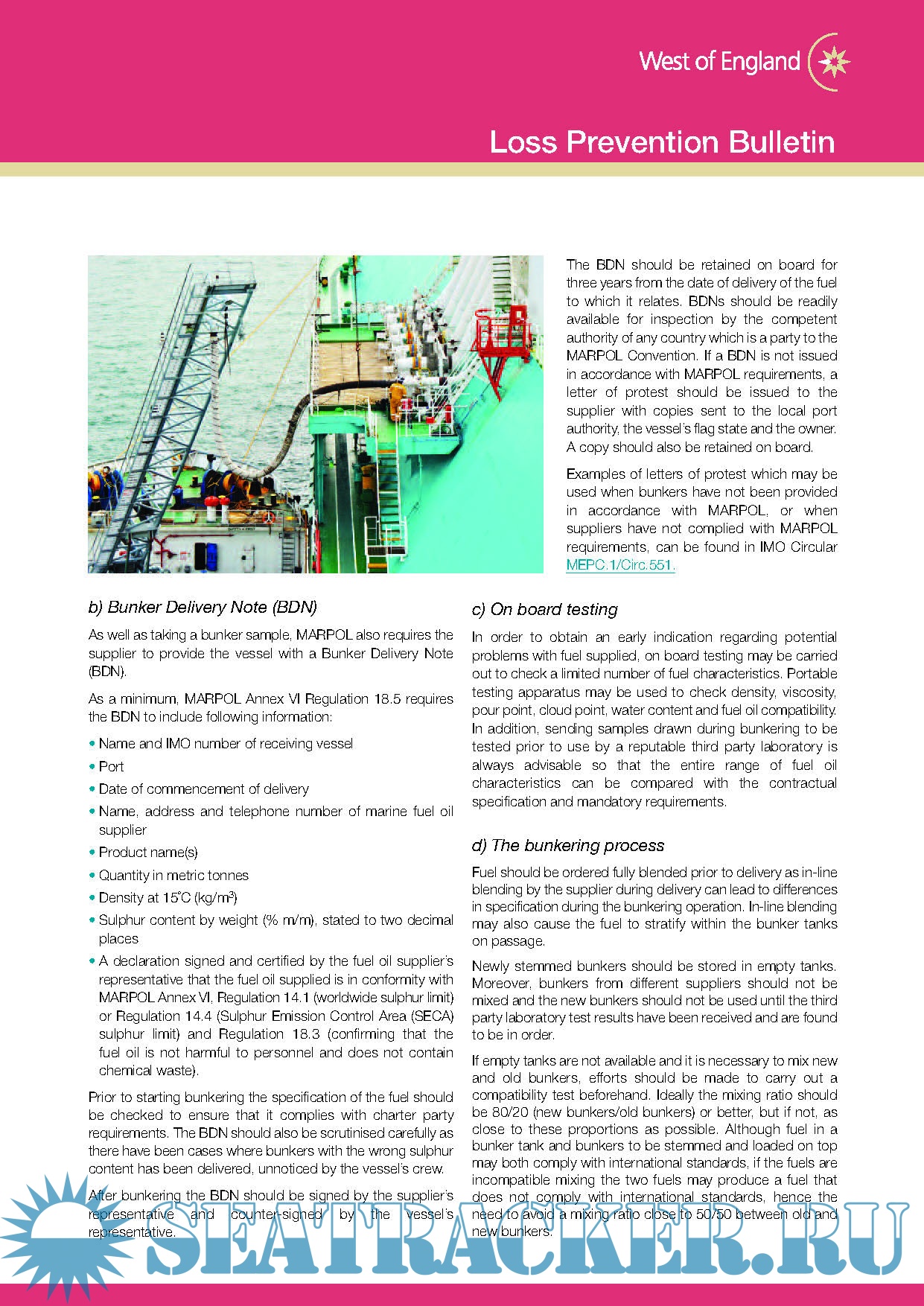 Description: When a vessel has been provided with off-specification bunkers the consequences can be severe, possibly leading to the breakdown of the vessel’s machinery. Even if off-specification bunkers do not result in a breakdown, the loss of time and expenses incurred if it is necessary to de-bunker or deviate to stem fresh bunkers can be significant.