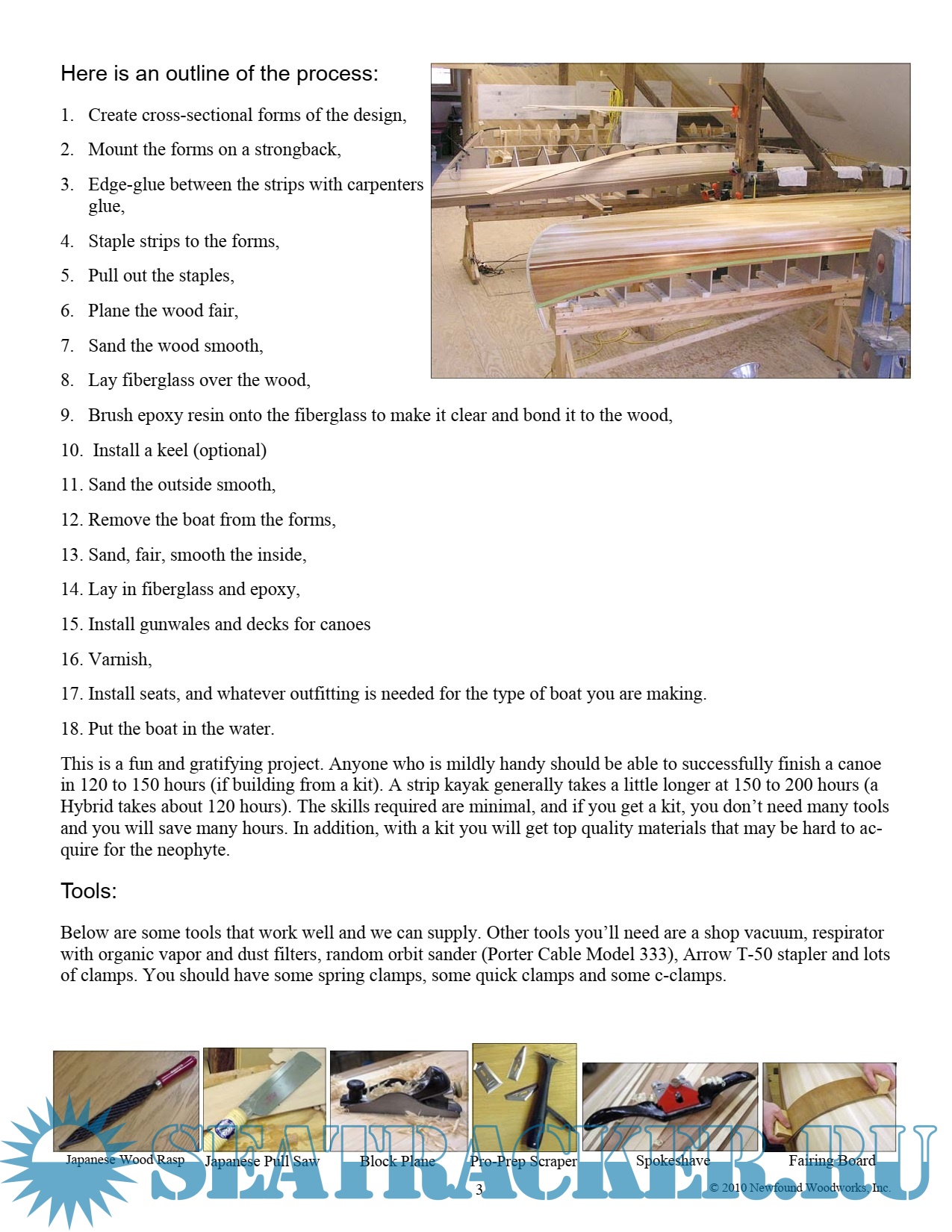 Description: This is a collection of the techniques we have used successfully in Building cedar Strip /epoxy Canoes . Some of these methods were developed from our own ex-periences in Strip Building (learning experiences!), some came from customers' suggestions, others came from the books we provide with kits. We find the process of Strip Building is an on-going educational experience. We are constantly updating our tools, techniques, and materials. Often there are several ways to do the same task; the best way for you to do something is the method you are most comfortable with. We are trying to expose you to different techniques and give you enough information so you will be able to complete your project successfully and enjoyably.