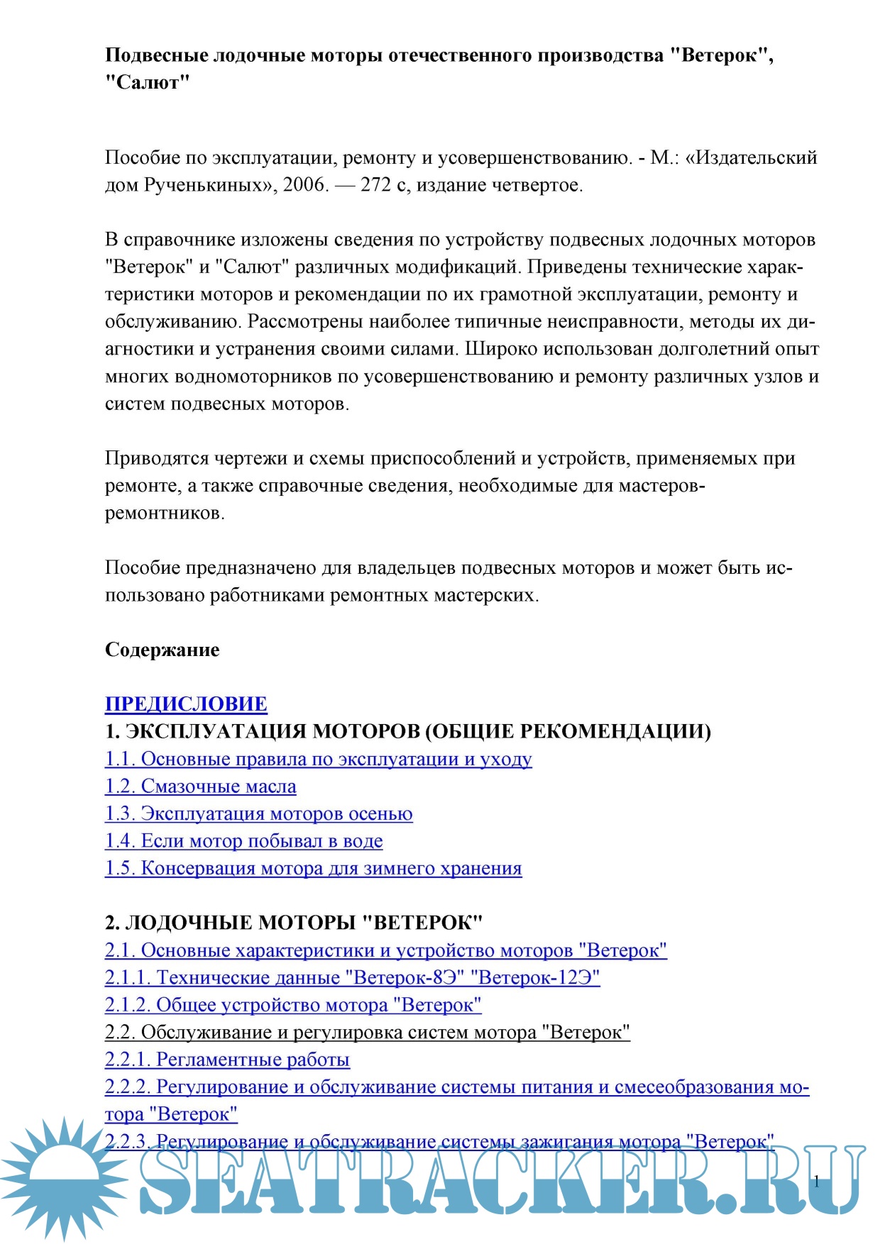 Описание: В справочнике изложены сведения по устройству подвесных лодочных моторов "Ветерок" и "Салют" различных модификаций. Приведены технические характеристики моторов и рекомендации по их грамотной эксплуатации, ремонту и обслуживанию. Рассмотрены наиболее типичные неисправности, методы их диагностики и устранения своими силами. Широко использован долголетний опыт многих водномоторников по усовершенствованию и ремонту различных узлов и систем подвесных моторов.