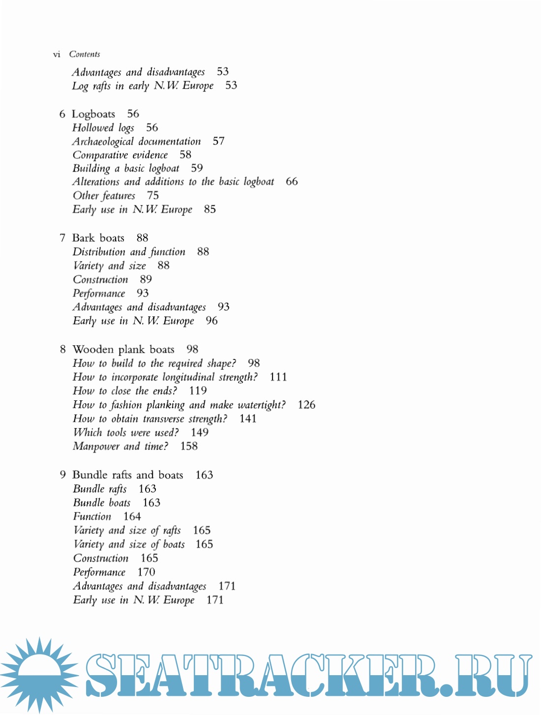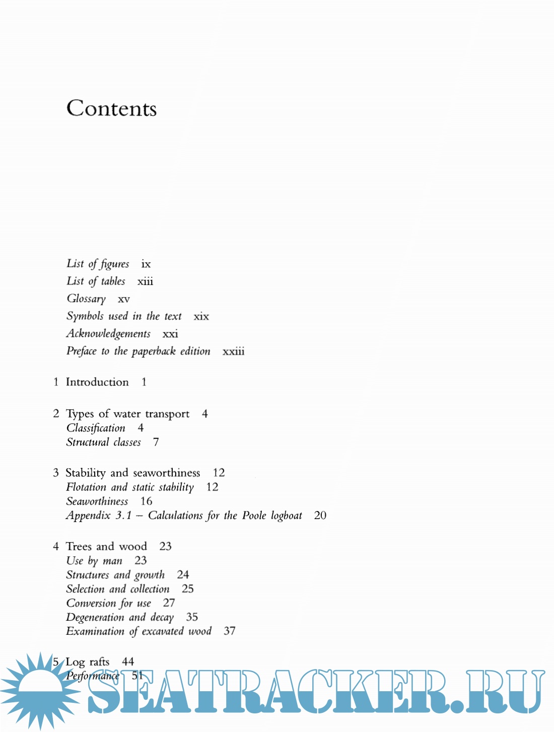 1. Introduction 2. Types of water transport 3. Stability and seaworthiness 4. Trees and wood 5. Log rafts 6. Logboats 7. Bark boats 8. Wooden plank boats 9. Bundle rafts and boats 10. Hide boats and float rafts 11. Assessment of performance 12. Population, steering and anchoring 13. Seamanship 14. Pilotage and navigation Index
