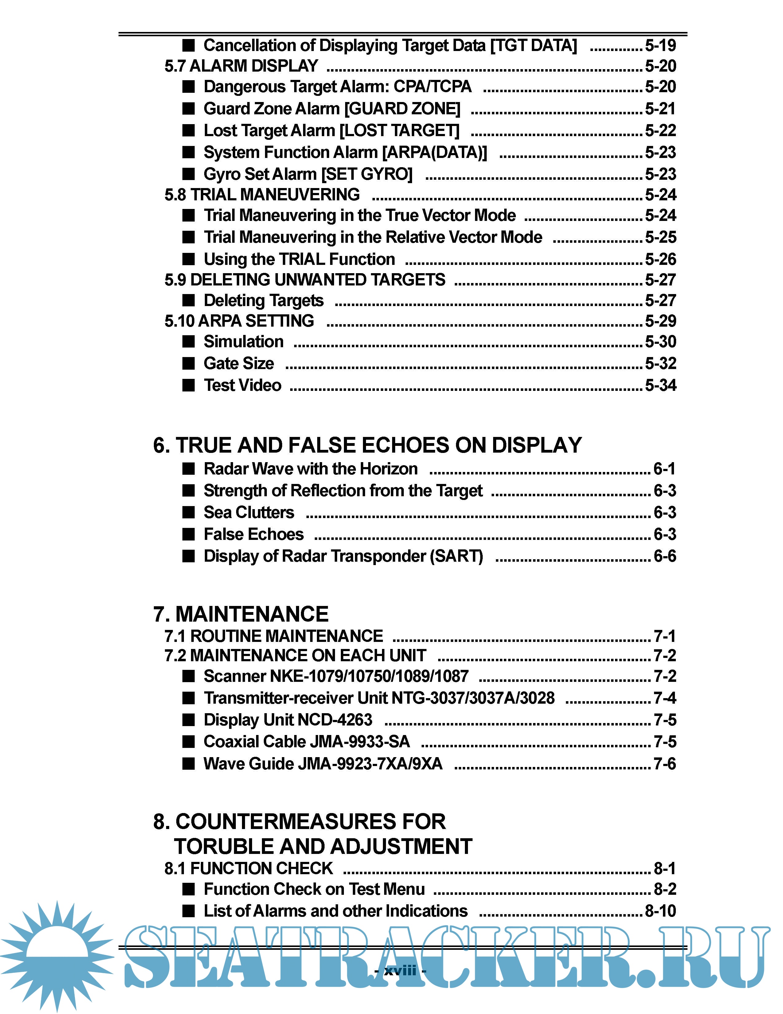 Year: 200X Language: english Author: JRC Genre: Manual Publisher: JRC Format: PDF Quality: Scanned pages Pages count: 404 Description: This equipment is a marine radar equipment designed to obtain safe operation of marine ships. This equipment consists of a radar signal transmitter-receiver unit, a CRT display unit and a scanner unit as its main units. • Before operating the equipment, be sure to read this instruction manual carefully for correct operation. • Maintain this instruction manual so that operators can refer to it at any time. • Refer to this manual when any inconvenience or defect occur.