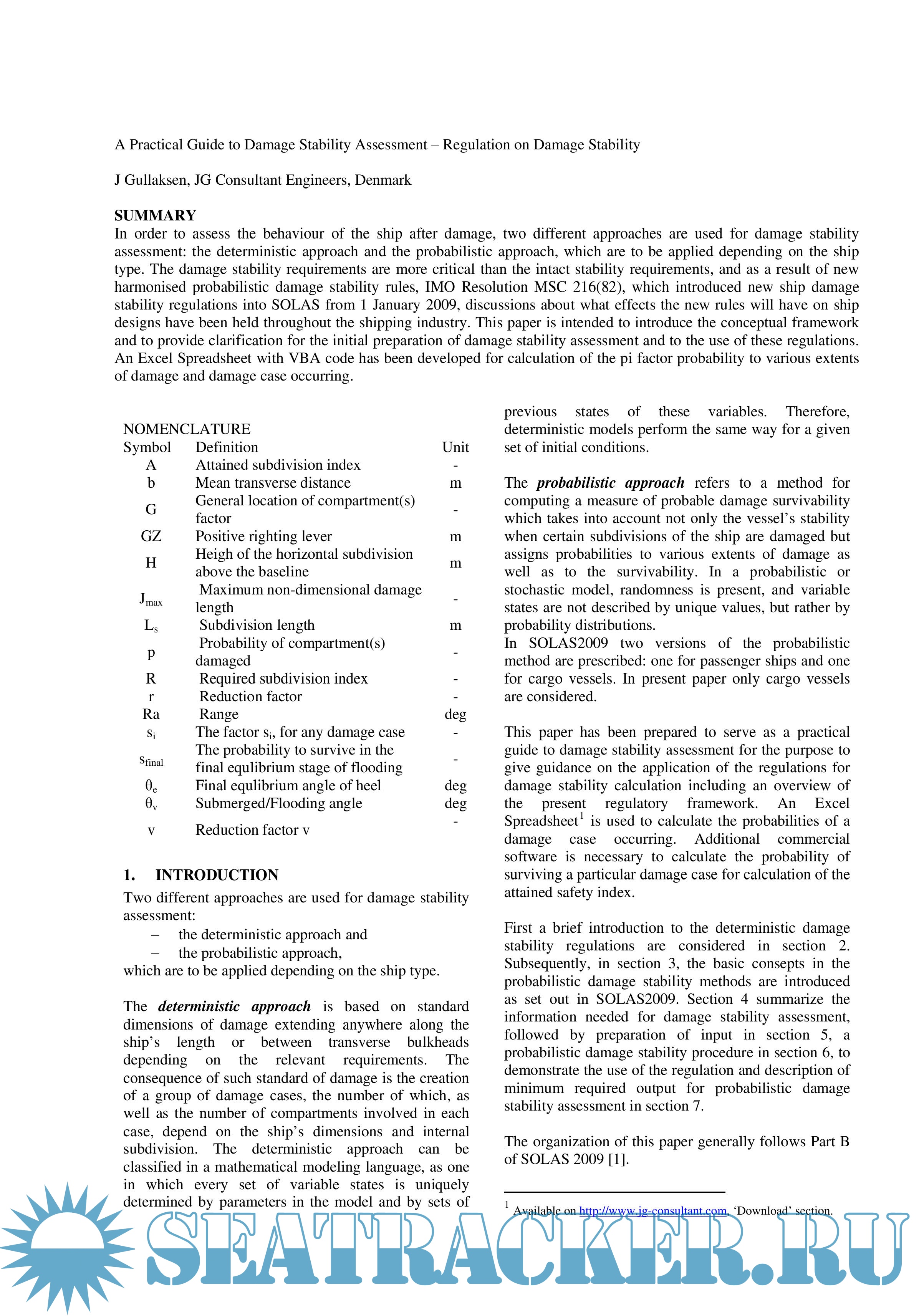 Year: 201x Language: english Author: J Gullaksen Format: PDF Quality: Unknown Pages count: 133 Description: SUMMARY: In order to assess the behaviour of the ship after damage, two different approaches are used for damage stability assessment: the deterministic approach and the probabilistic approach, which are to be applied depending on the ship type. The damage stability requirements are more critical than the intact stability requirements, and as a result of new harmonised probabilistic damage stability rules, IMO Resolution MSC 216(82), which introduced new ship damage stability regulations into SOLAS from 1 January 2009, discussions about what effects the new rules will have on ship designs have been held throughout the shipping industry. This paper is intended to introduce the conceptual framework and to provide clarification for the initial preparation of damage stability assessment and to the use of these regulations. An Excel Spreadsheet with VBA code has been developed for calculation of the pi factor probability to various extents of damage and damage case occurring. Two different approaches are used for damage stability assessment: - the deterministic approach and - the probabilistic approach, which are to be applied depending on the ship type. This paper has been prepared to serve as a practical guide to damage stability assessment for the purpose to give guidance on the application of the regulations for damage stability calculation including an overview of the present regulatory framework. An Excel Spreadsheet I is used to calculate the probabilities of a damage case occurring. Additional commercial software is necessary to calculate the probability of surviving a particular damage case for calculation of the attained safety index. Included APPENDIX A_ Excel Spreadsheet: A numerical method is implemented in a VBA script in an Excel spreadsheet. The spreadsheet with VBA macros, SOLAS2009_JGCE.xlsm8, includes the inputs with main parameters and calculates the p-factor probabilities of a damage case occurring.
