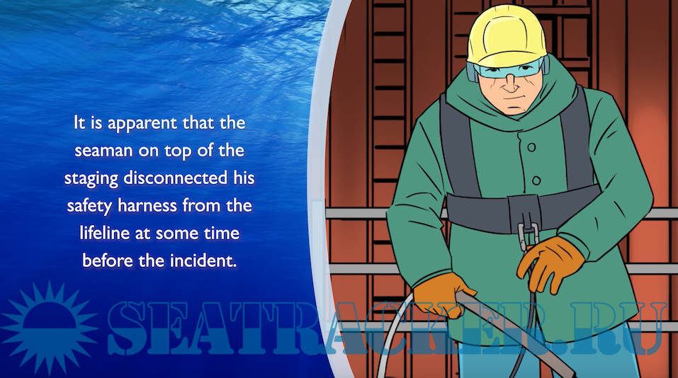 It is apparent that the seaman on top of the staging disconnected his safety harness from the lifeline at some time before the incident. Work aloft in any circumstances requires careful planning and implementation of appropriate safety precautions. When a ship is at sea, the necessity of performing such work should be very carefully considered, particularly taking into account the possibility of unexpected ship motion and the limitations of available equipment. In the case of hold cleaning, the crew are not expected to take unreasonable risks in complying with a commercial requirement of presenting clean holds in readiness to load the next cargo.