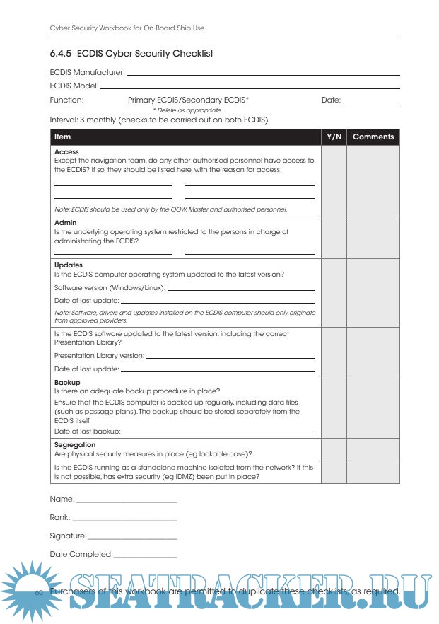 Year: 2021 Language: english Author: Witherbys, BIMCO & ICS Publisher: Witherby Publishing Group Ltd. Edition: 2nd ISBN: 978-1-85609-946-2 Format: JPEG Quality: Photo of pages Pages count: 121 Description: This is a practical and easy to understand guide to support the Master and the ship’s crew with cyber security risk management. It provides detailed guidance on all aspects of cyber security protection, defence and response (including new sections on remote access, intrusion detection systems and engine department considerations). It also includes comprehensive checklists to assist with the practical, day-to-day management of onboard cyber security. 'Cyber Security Workbook for On Board Ship Use' is referenced in ISGOTT Sixth Edition as a source of practical guidance for Masters and ship’s crew (ref: ISGOTT 6, section 6.4, para.3). Additional info: Blank pages have been delibrately omitted. These are screenshots from Witherby Reader Software compiled together as searchable PDF, hence zooming will distort clarity! Please consider buying a legal copy for crystal clear text !