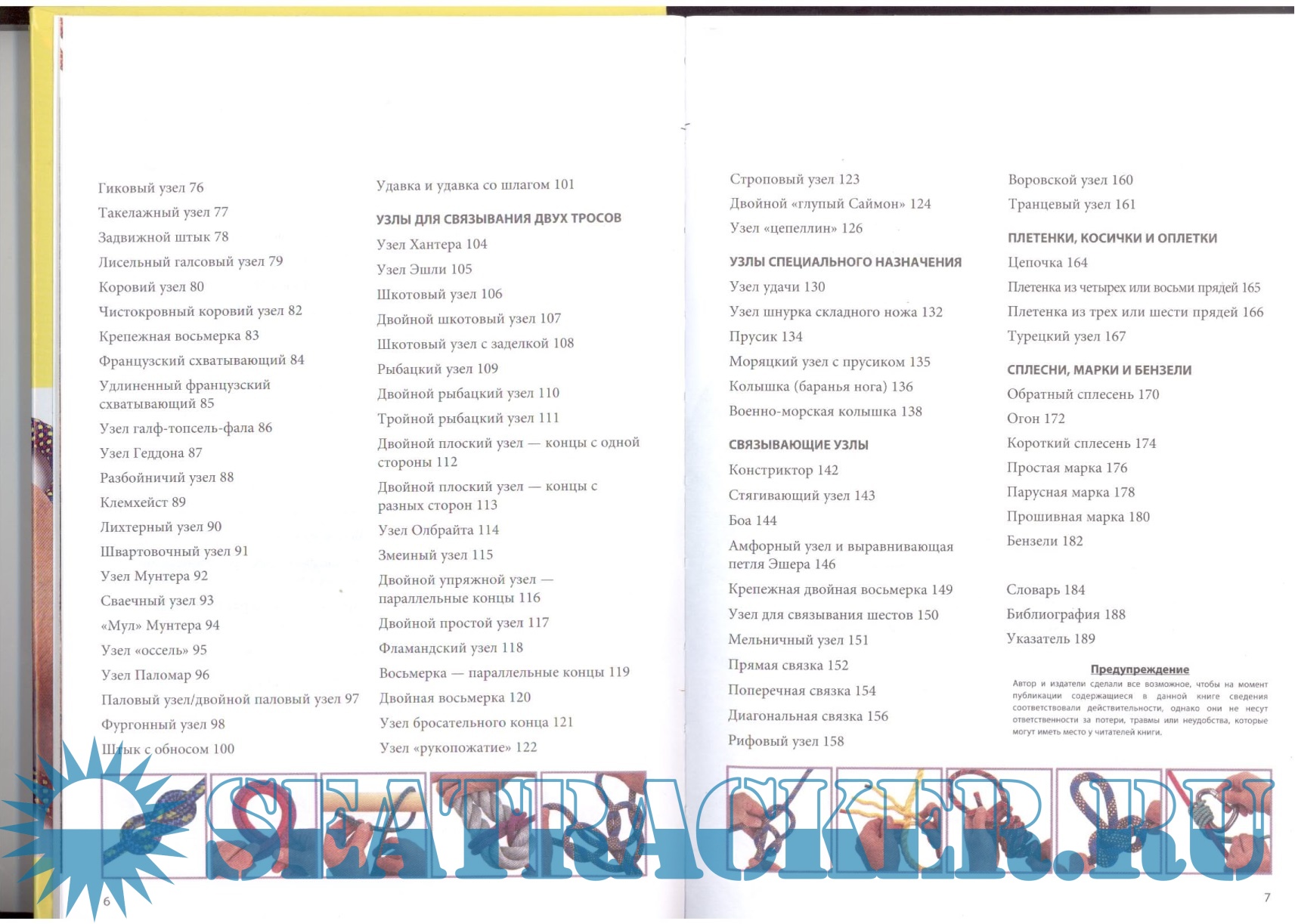 Вводная часть знакомит с конструкцией тросов, разновидностями тросов и веревок, правилами по уходу за ними, а также предлагает интересные сведения из истории узлов и наузистики. Каждая глава посвящена определенной группе узлов, чтобы читателю было легче ориентироваться. Для всех узлов приводятся подробные пошаговые инструкции вязки, проиллюстрированные фотографиями, а также подсказки и связанные с узлами легенды, важные рекомендации, касающиеся прочности и надежности узла, а также условные обозначения, указывающие на возможные области применения.